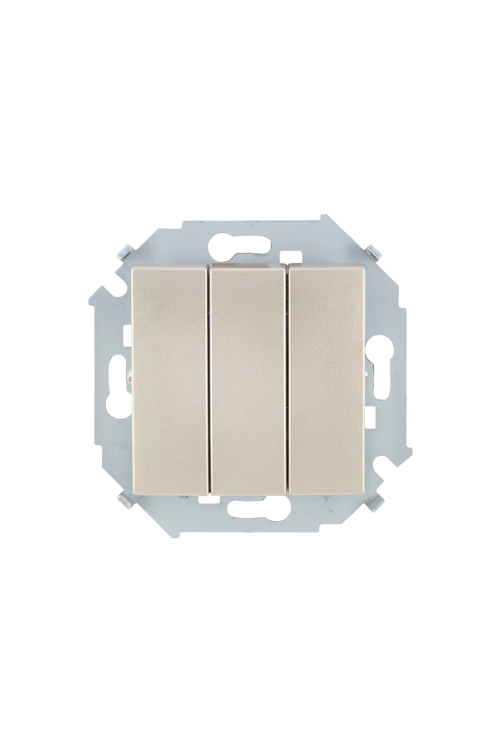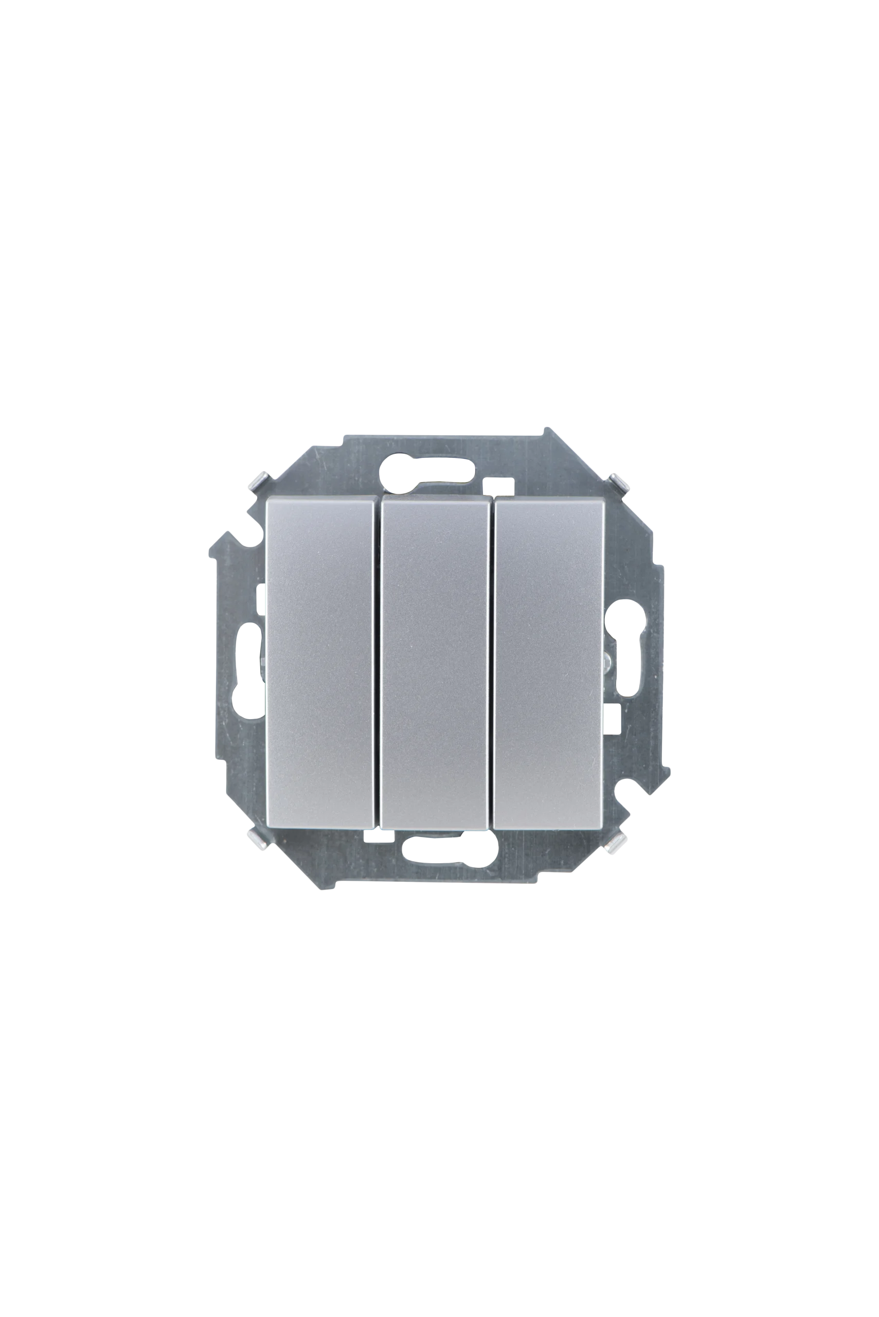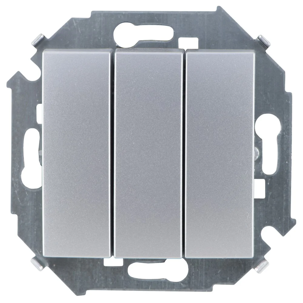 Механизм выключателя света клавишный на 1 пост 3 клавиши (непроходной). Цвет — серый. Без фронтальной рамки. Уровень пылевлагозащиты IP20. Выключатель устанавливается в стандартный круглый подрозетник. Габаритные размеры: длина 71 мм, ширина 71 мм, высота 52 мм. Гарантийный срок 10 лет.