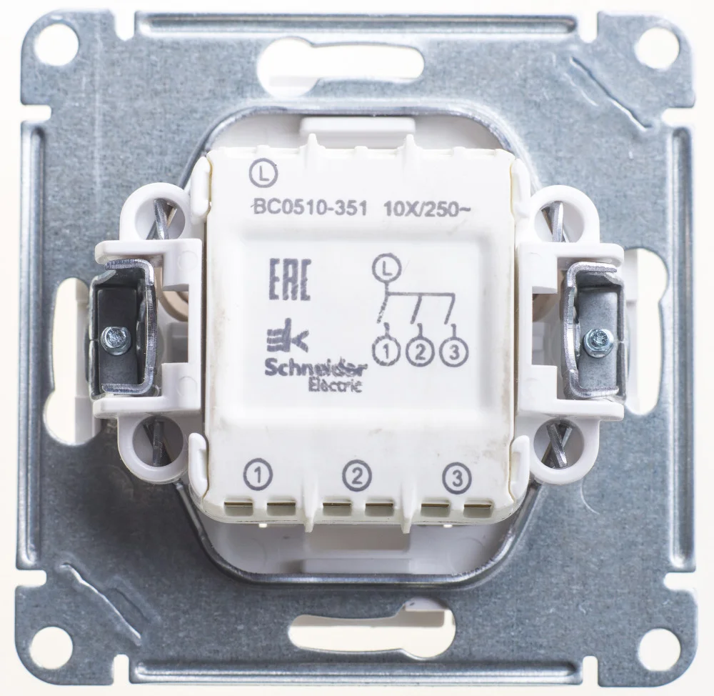Механизм Systeme Electric (ранее Schneider Electric) серии Glossa (цвет дерево дуб) выключателя 3-клавишного подходит для сетей 250 В, на ток 10 А. — Трёхклавишный выключатель позволяет управлять тремя источниками света из одной точки. — Выполнен из материала PС+ASA, стойкого к УФ-излучению и появлению царапин. — Эргономичные клеммы расположены в два ряда: сверху и снизу.