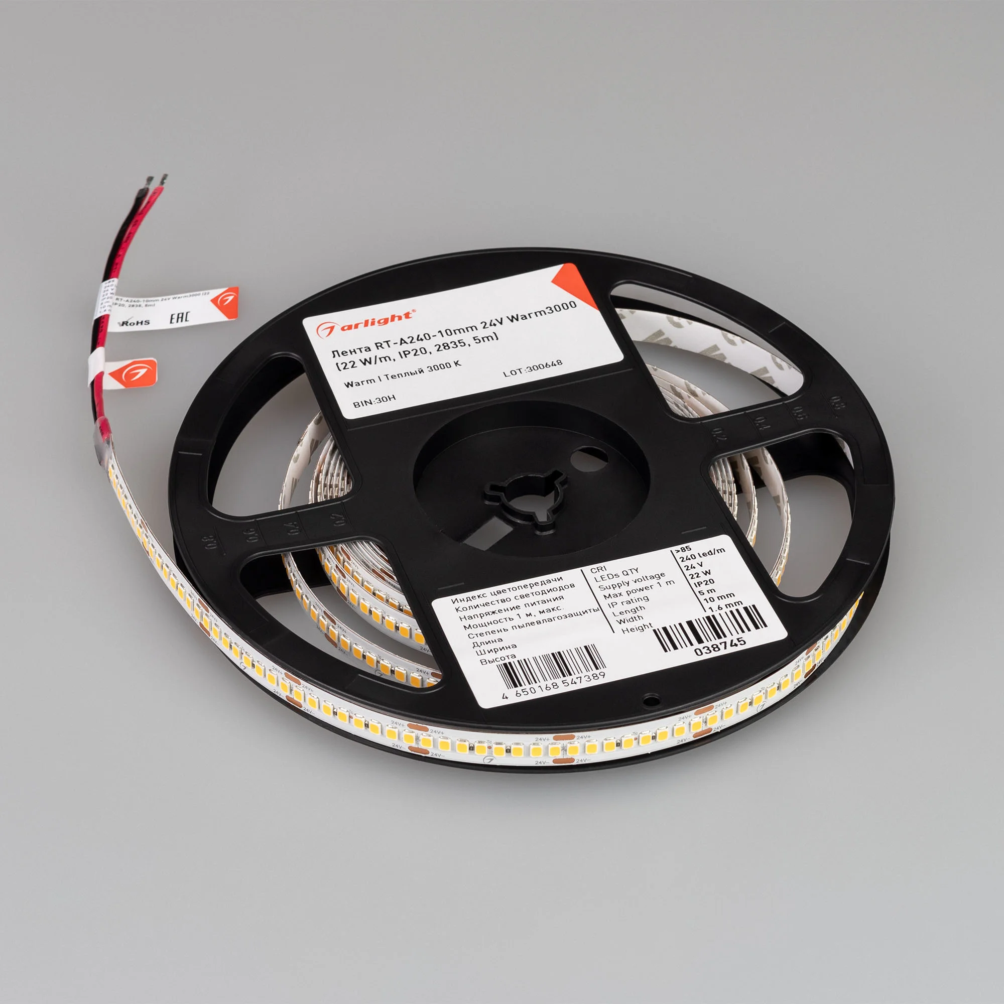 Arlight Лента RT-A240-10mm 24V Warm3000 (22 W/m, IP20, 2835, 5m) (высок.эфф.150 лм/Вт)