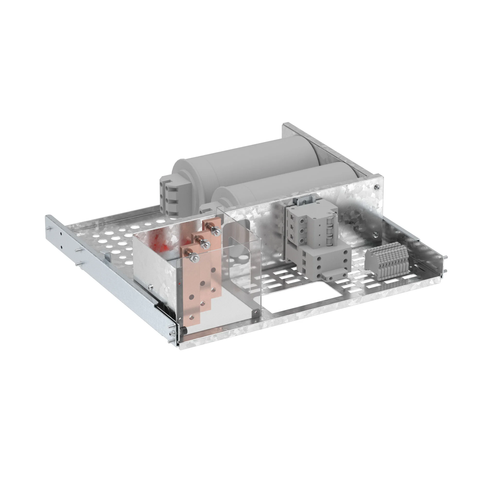 Комплект выкатного варианта отсека для организации встроенного решения УКРМ максимальной мощностью до 100 кВАр с возможностью установки конденсаторов, а также антирезонансного дросселя. Подходит для напольных шкафов CQE N шириной 800 и высотой 400 мм. Глубина отсека в 500 мм позволяет установить его в шкаф одностороннего или двухстороннего обслуживания глубиной от 600 мм.