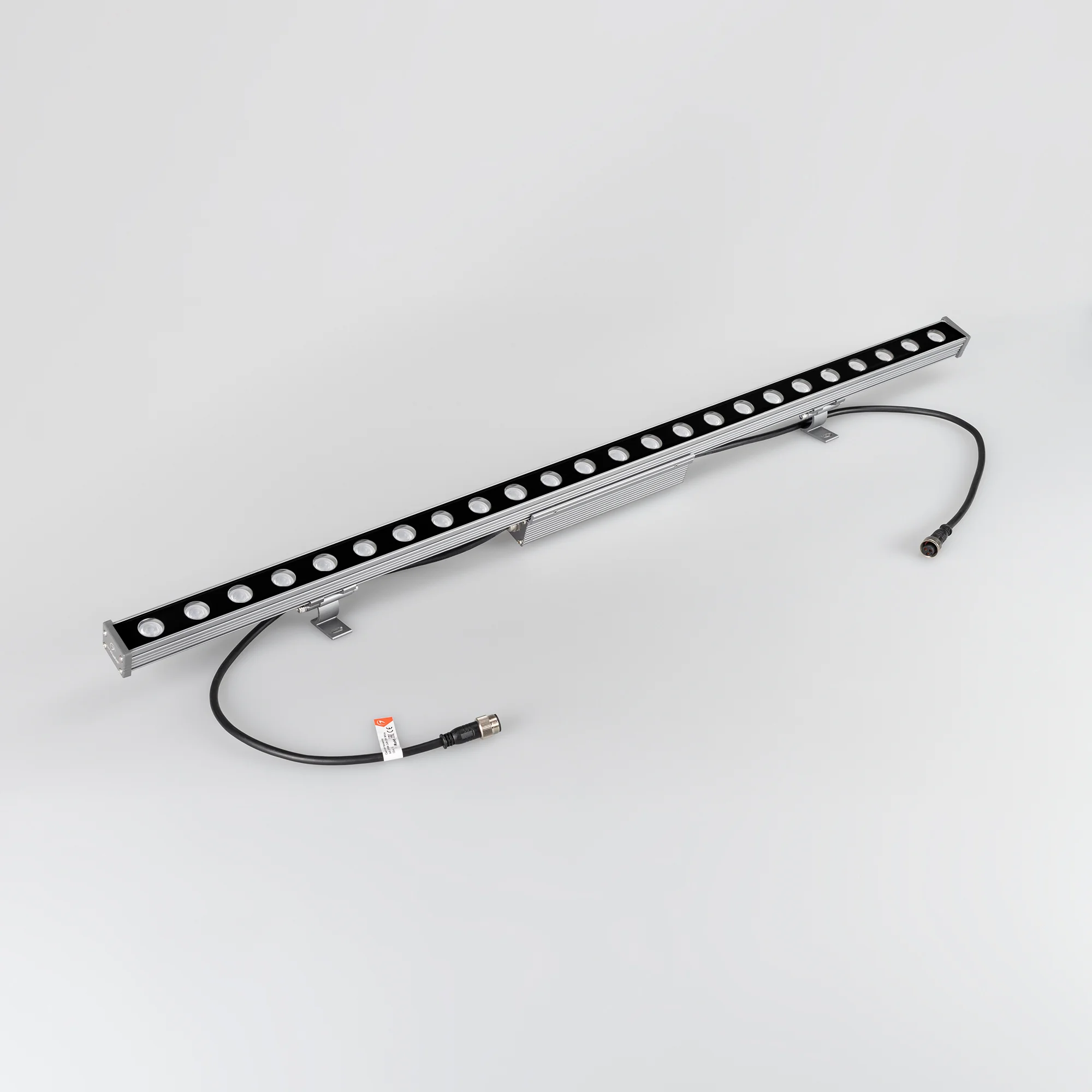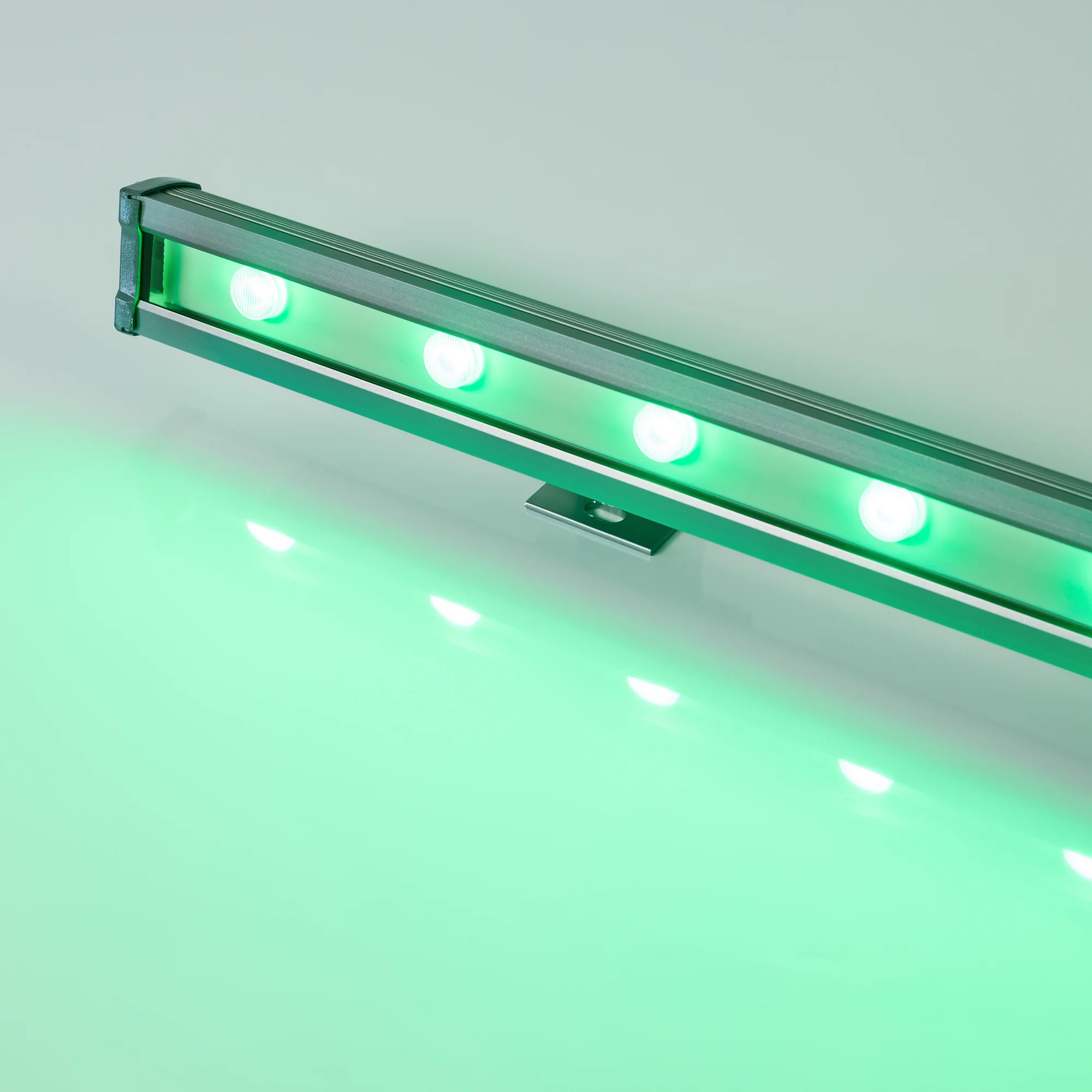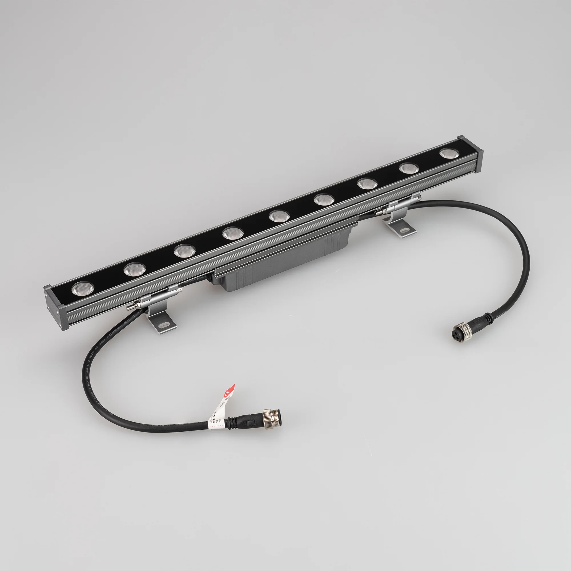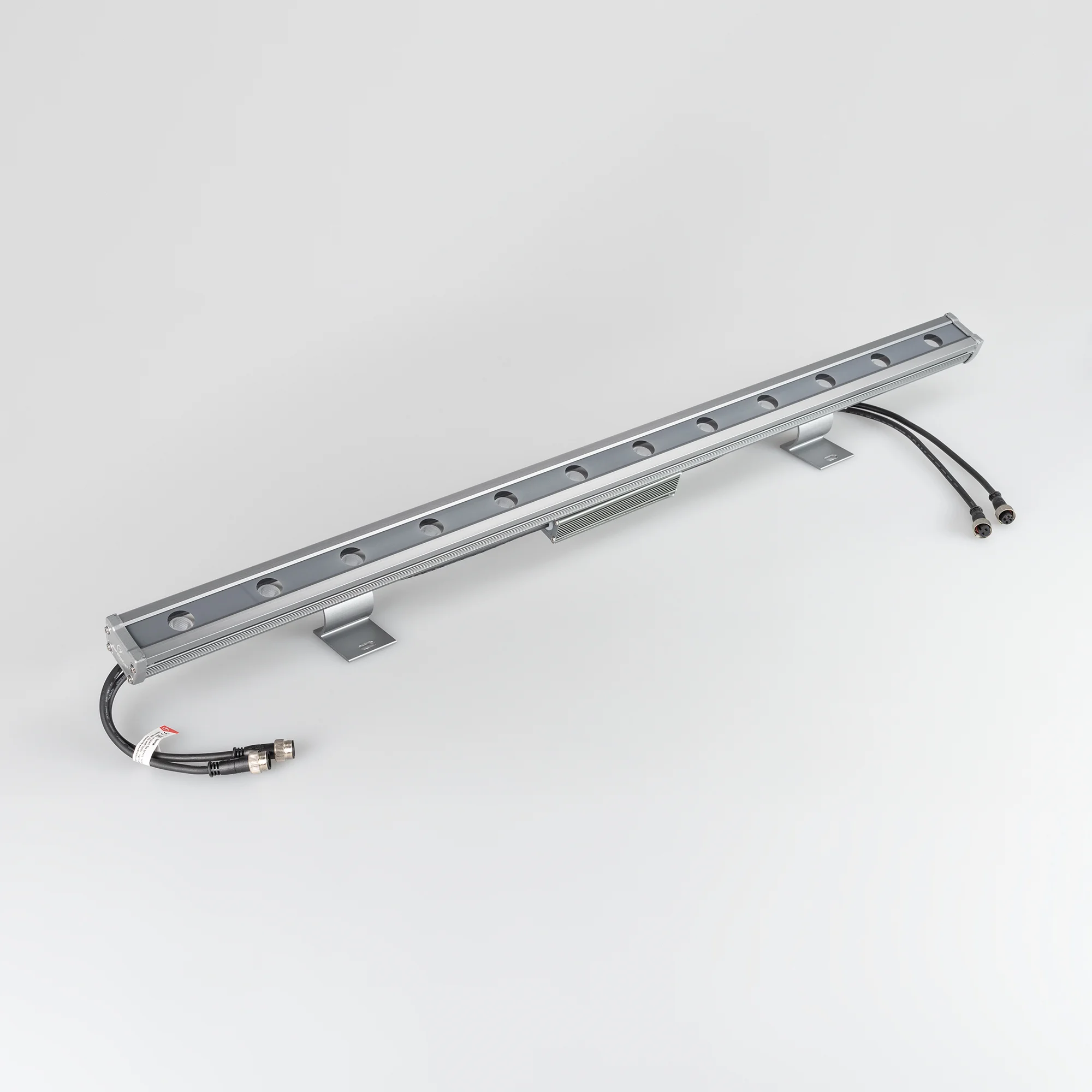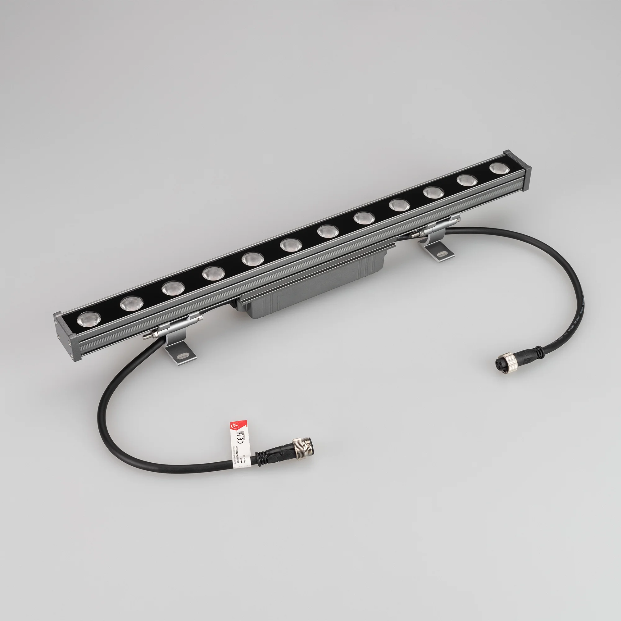 Линейный светодиодный прожектор «WALLWASHER. Мощность 48W, напряжение питания DC 24V. Количество светодиодов 12 штук. Цвет светодиодов RGB-Day(4000K) (4 кристалла в каждом светодиоде), управление по протоколу DMX512, угол рассеивания 15×45°. Корпус: алюминиевый сплав и армированное стекло. Цвет корпуса серый, степень влагозащиты IP65. Габариты 1000x54x35мм.