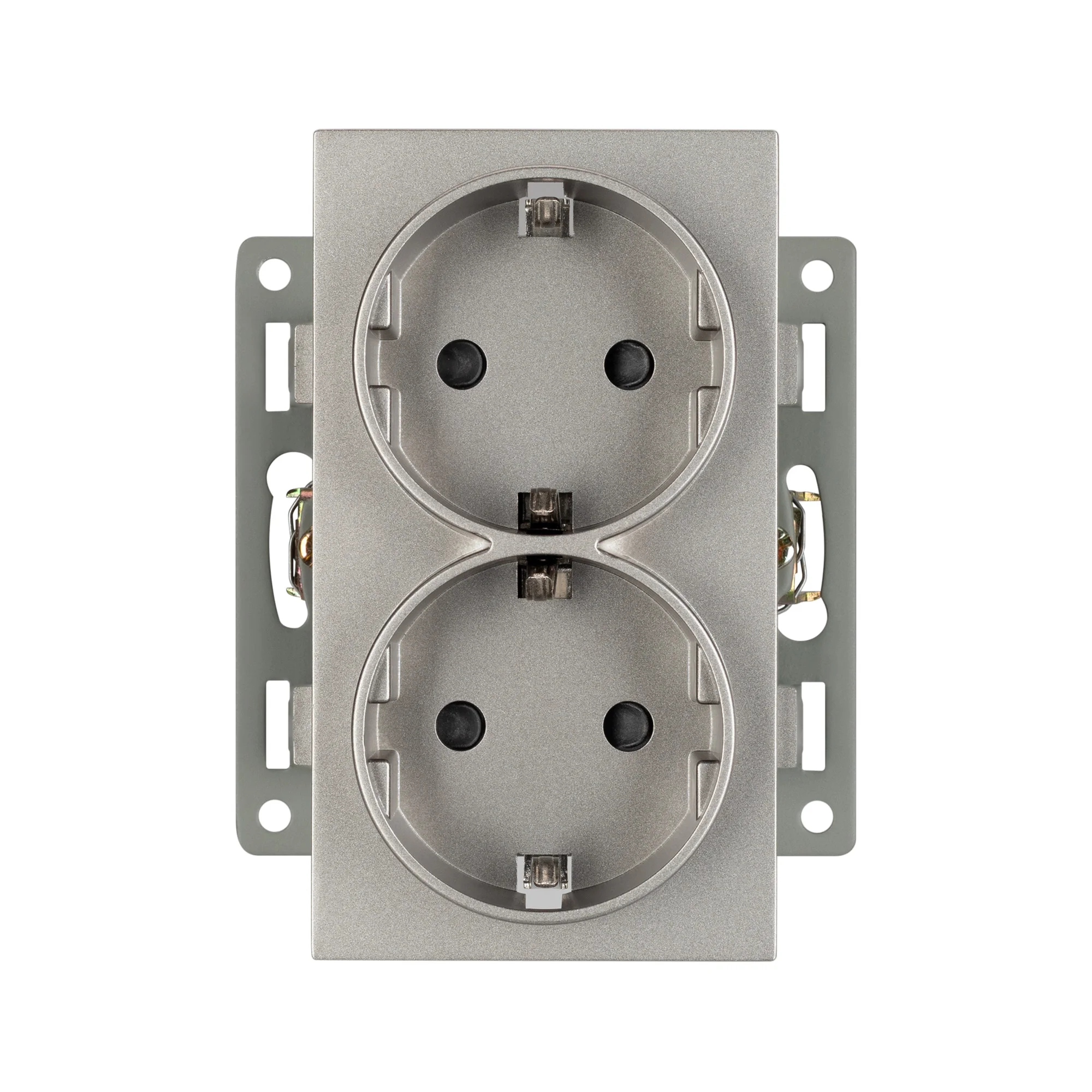 Механизм розетки вертикальный, с заземлением на 2 поста и с суппортом из алюминия. Цвет — серый. Степень пылевлагозащиты — IP20. Устанавливается в сдвоенный круглый подрозетник 220V. Рабочее напряжение 110-250V. Макс. ток нагрузки 16А. Габаритные размеры: длина 74 мм, ширина 93 мм, высота 35 мм. Гарантийный срок 10 лет.