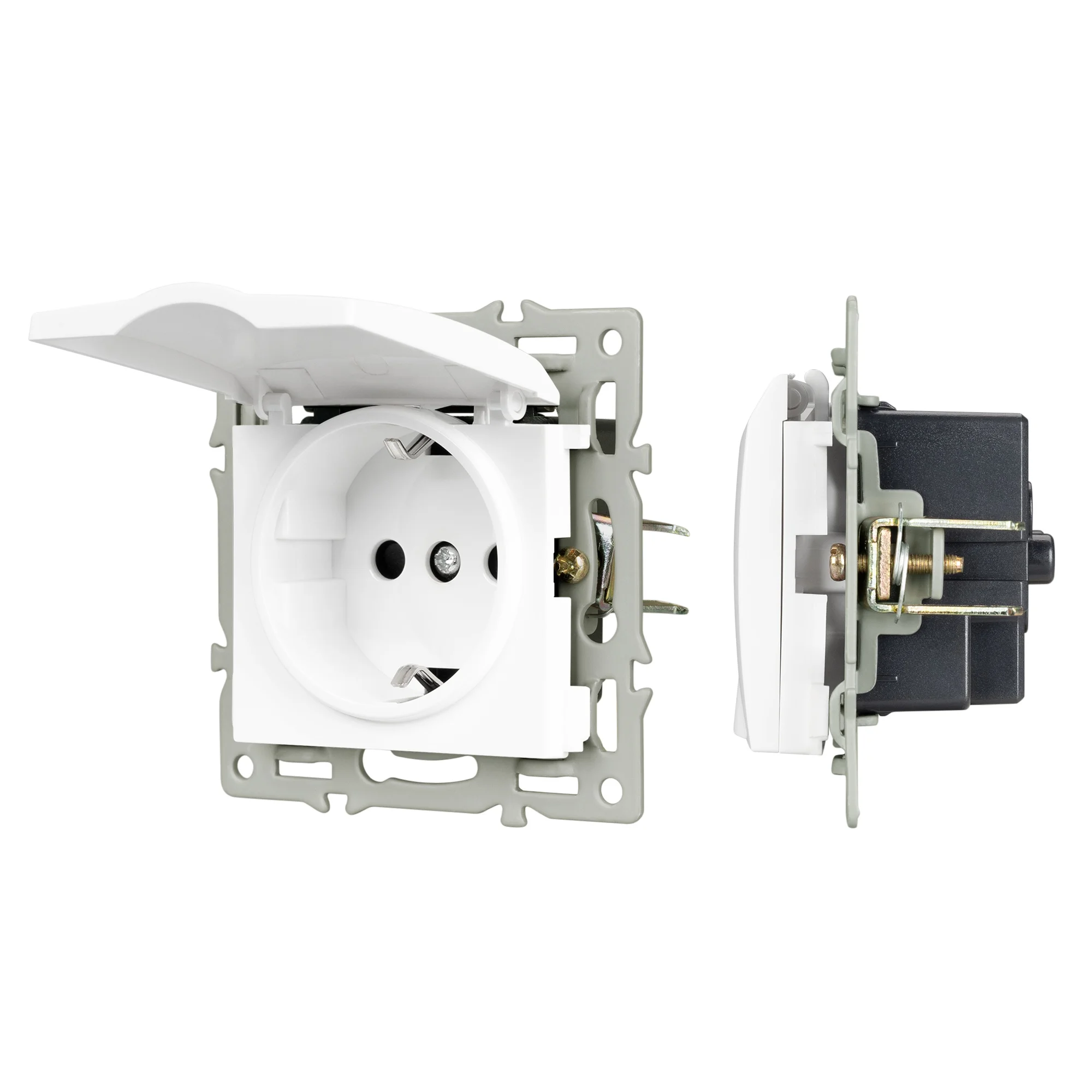 Механизм розетки с заземлением на 1 пост с влагозащитной крышкой. Цвет — белый. Без фронтальной рамки. Уровень пылевлагозащиты IP44. Устанавливается в стандартный подрозетник. Габаритные размеры: длина 71 мм, ширина 71 мм, высота 52 мм. Гарантийный срок 10 лет.
