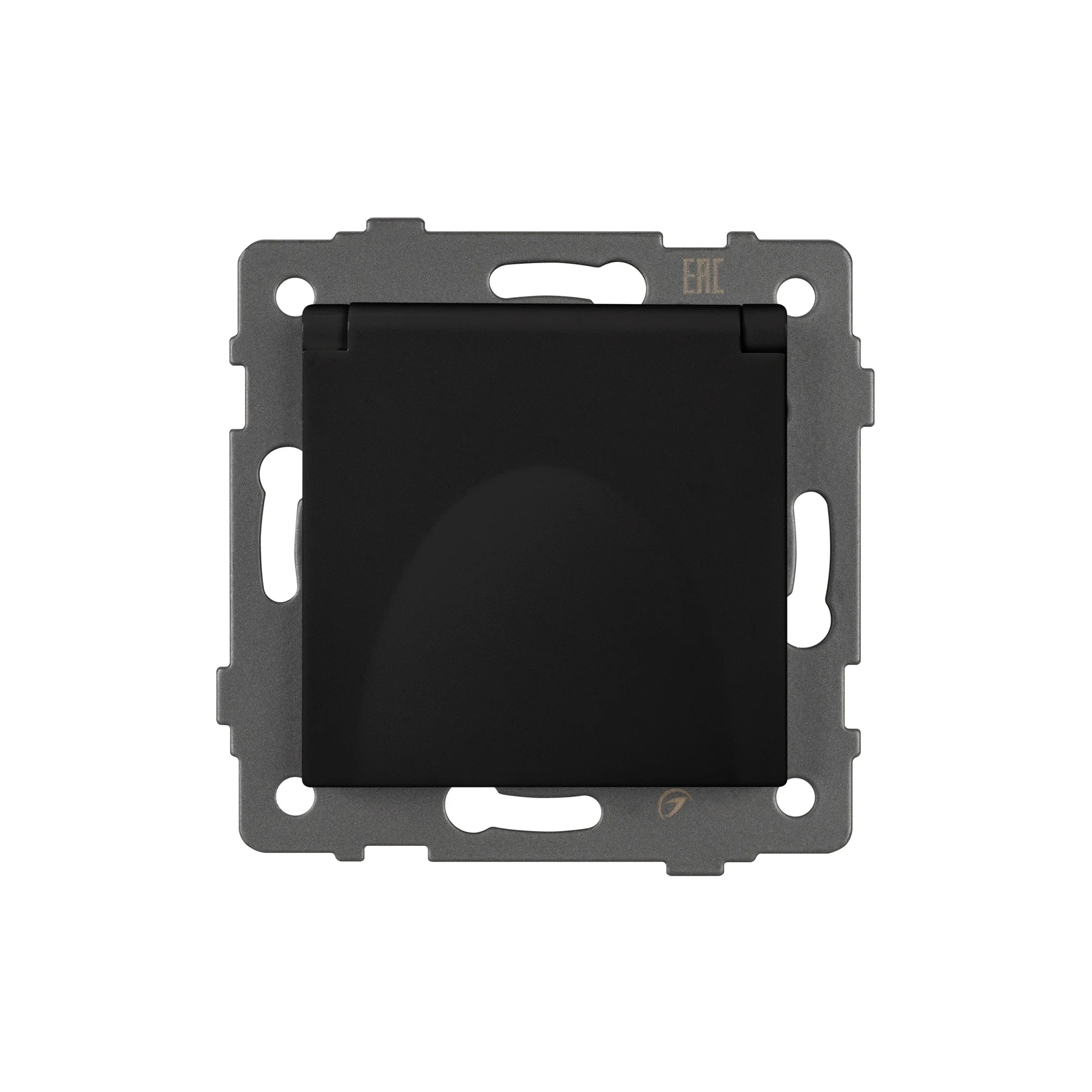 Механизм розетки с заземлением на 1 пост с влагозащитной крышкой. Цвет — черный. Без фронтальной рамки. Уровень пылевлагозащиты IP44. Устанавливается в стандартный подрозетник. Габаритные размеры: длина 71 мм, ширина 71 мм, высота 52 мм. Гарантийный срок 10 лет.