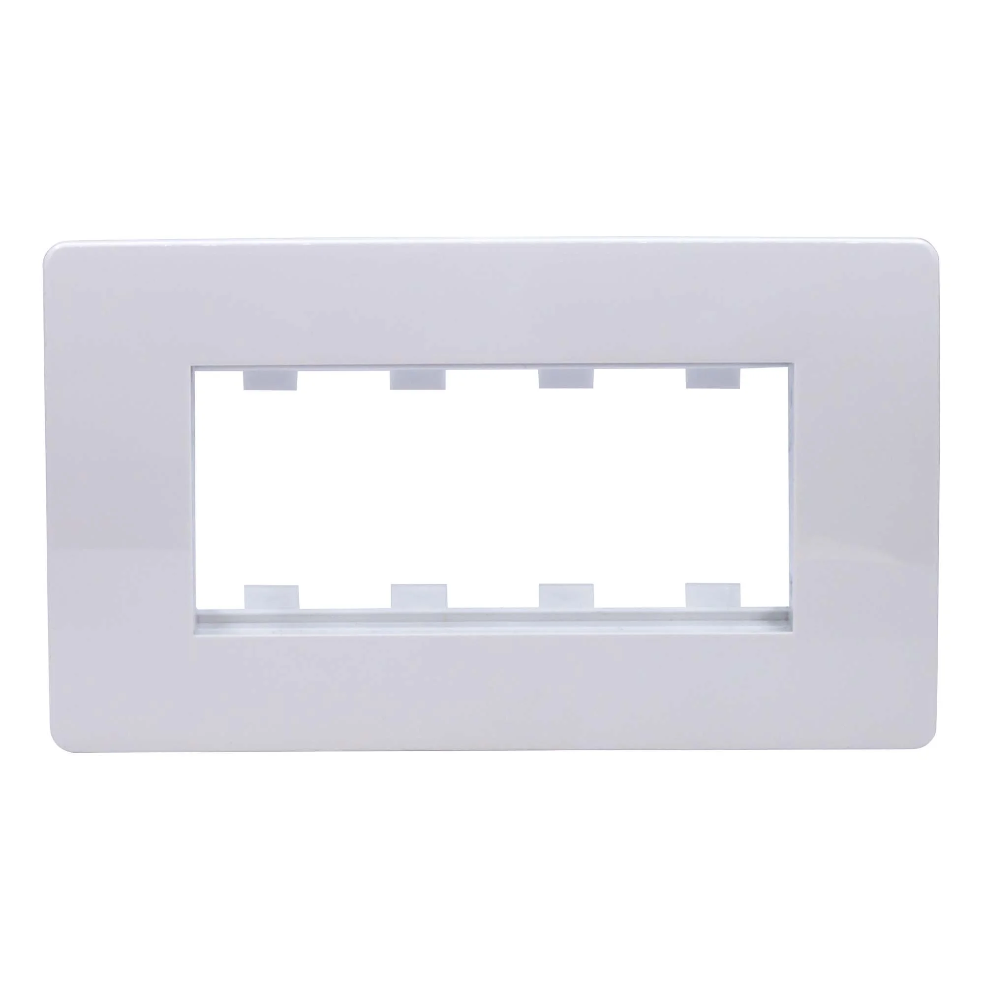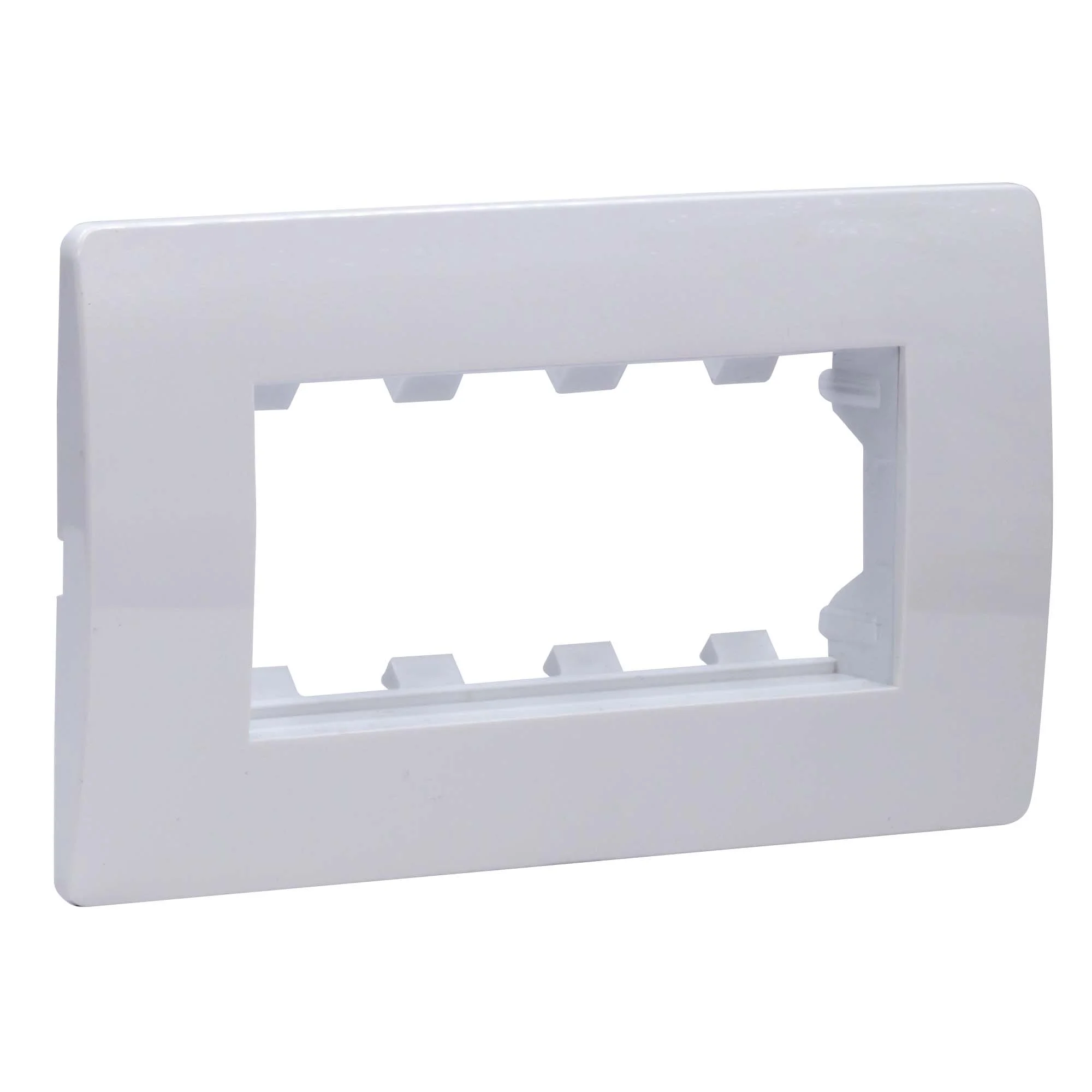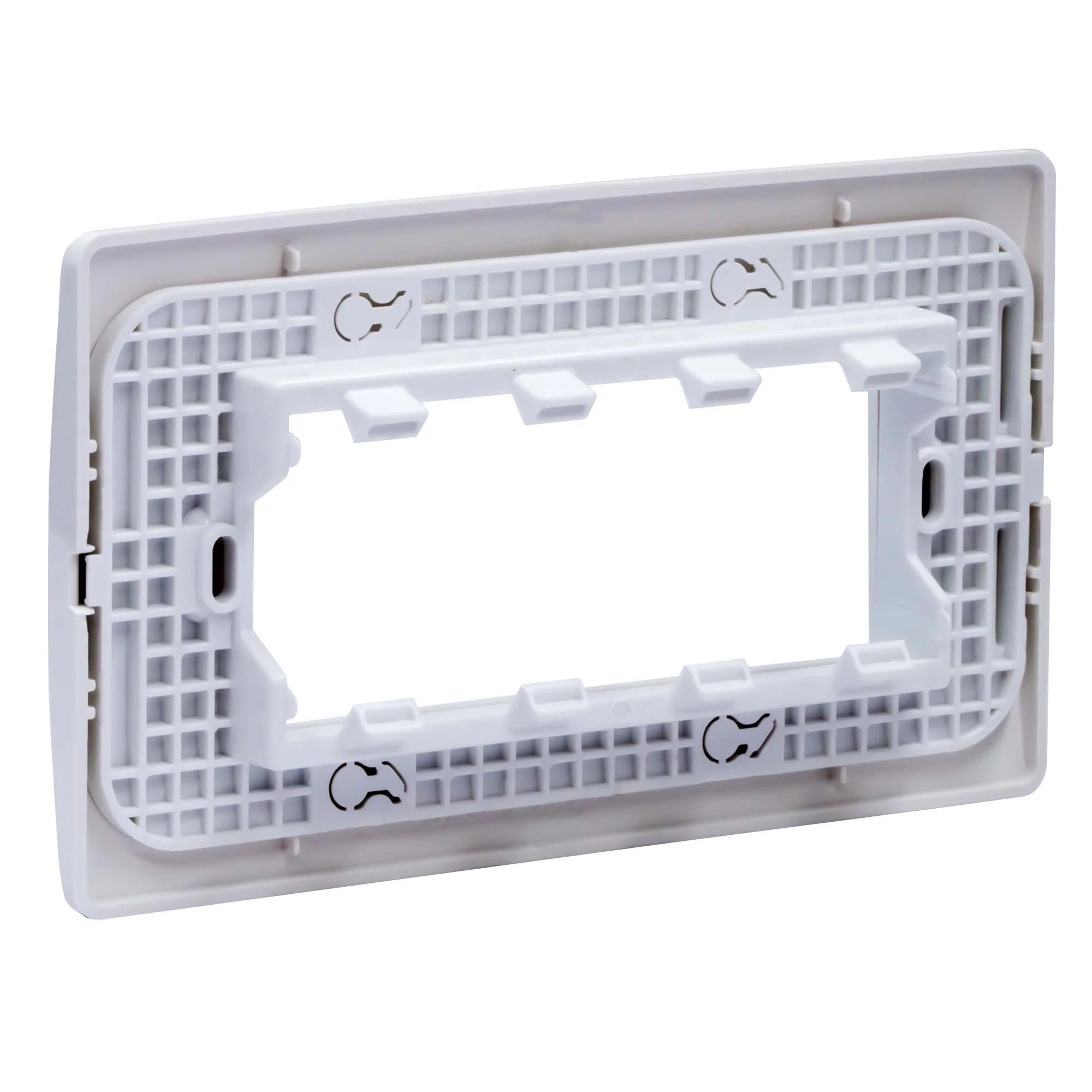 Каркас в сборе с рамками под 4 модуля электроустановочных изделий «Viva». Назначение: организация рабочего места. Условия монтажа: электроустановочное изделие серии «Viva» монтируется в каркас защелкиванием; каркас в коробку монтируется саморезом; рамка на каркас – защелкиванием. Характеристики: материал – АБС-пластик. Комплектация: каркас; рамка. Цвет белый