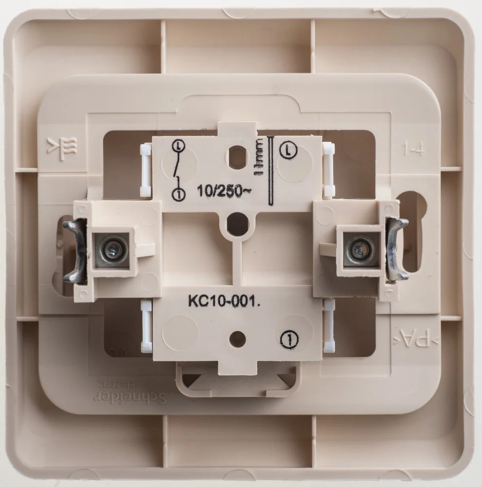 Механизм Systeme Electric (ранее Schneider Electric) серии Glossa (цвет молочный) выключателя 1-клавишного с самовозвратом подходит для сетей 250 В, на ток 10 А. — Выполнен из материала PС+ASA, стойкого к УФ-излучению и появлению царапин. — Эргономичные клеммы расположены в два ряда: сверху и снизу.