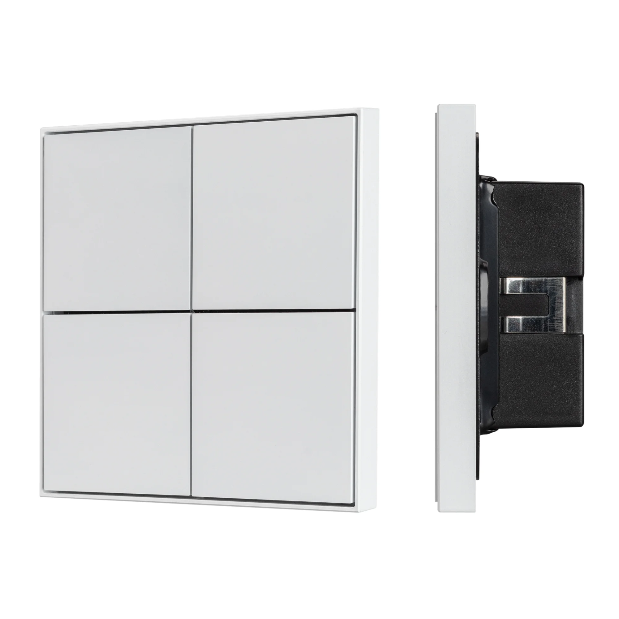 Универсальная многофункциональная встраиваемая настенная панель для систем KNX. 4 рокерные клавиши, 1 клавиша может выполнять функции 2-х клавиш. Безрамочный корпус, материал — алюминий, отклик вибрацией, светодиодная индикация. Цвет корпуса — белый. Питание от шины KNX DC 21-30V. Габариты 86x86x33 мм.