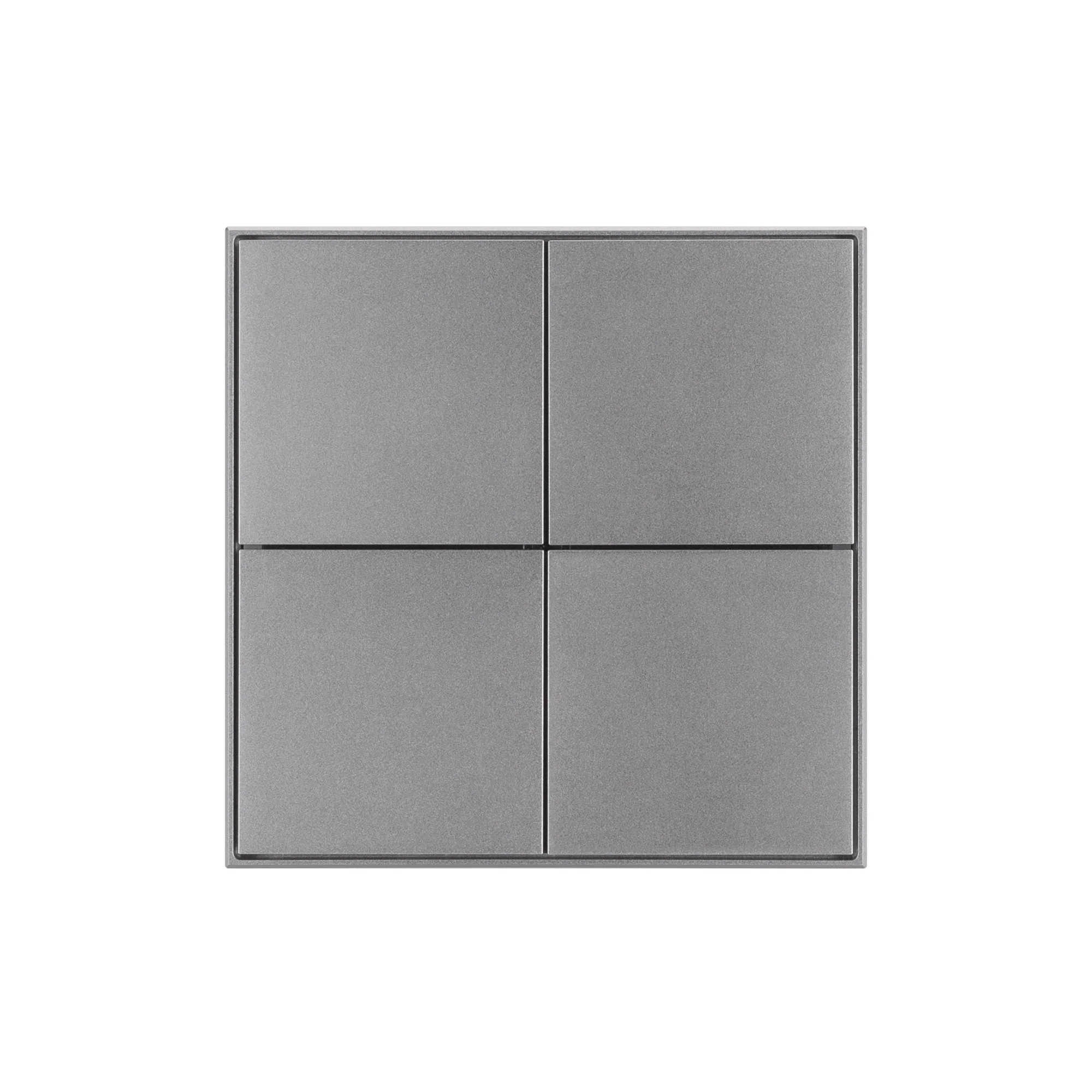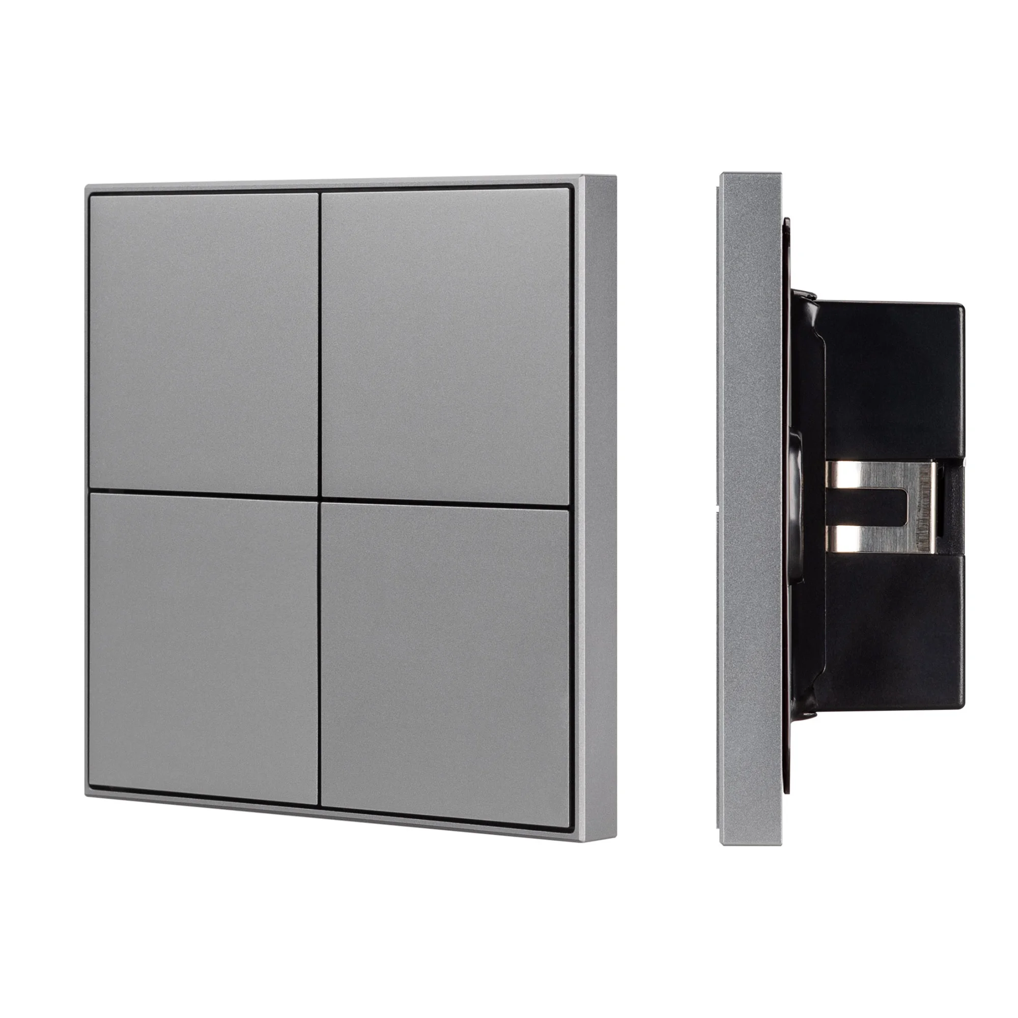 Универсальная многофункциональная встраиваемая настенная панель для систем KNX. 4 рокерные клавиши, 1 клавиша может выполнять функции 2-х клавиш. Безрамочный корпус, материал — алюминий, отклик вибрацией, светодиодная индикация. Цвет корпуса — серый. Питание от шины KNX DC 21-30V. Габариты 86x86x33 мм.