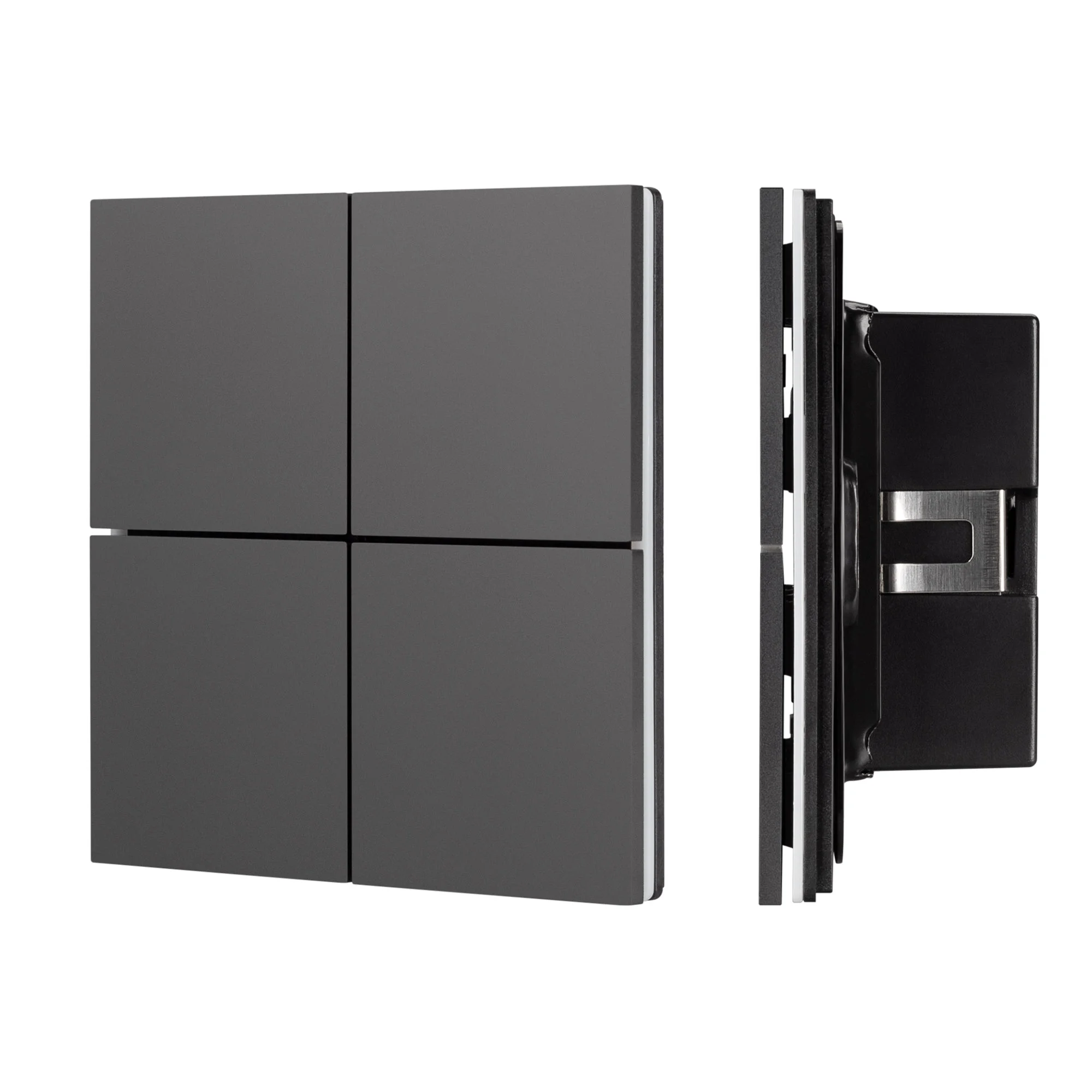 Универсальная многофункциональная встраиваемая настенная сенсорная панель для систем KNX. 4 сенсорные клавиши. Безрамочный корпус, материал — алюминий, светодиодная индикация. Цвет корпуса — тёмно-серый. Питание от шины KNX DC 21-30V. Габариты 86x86x33 мм.