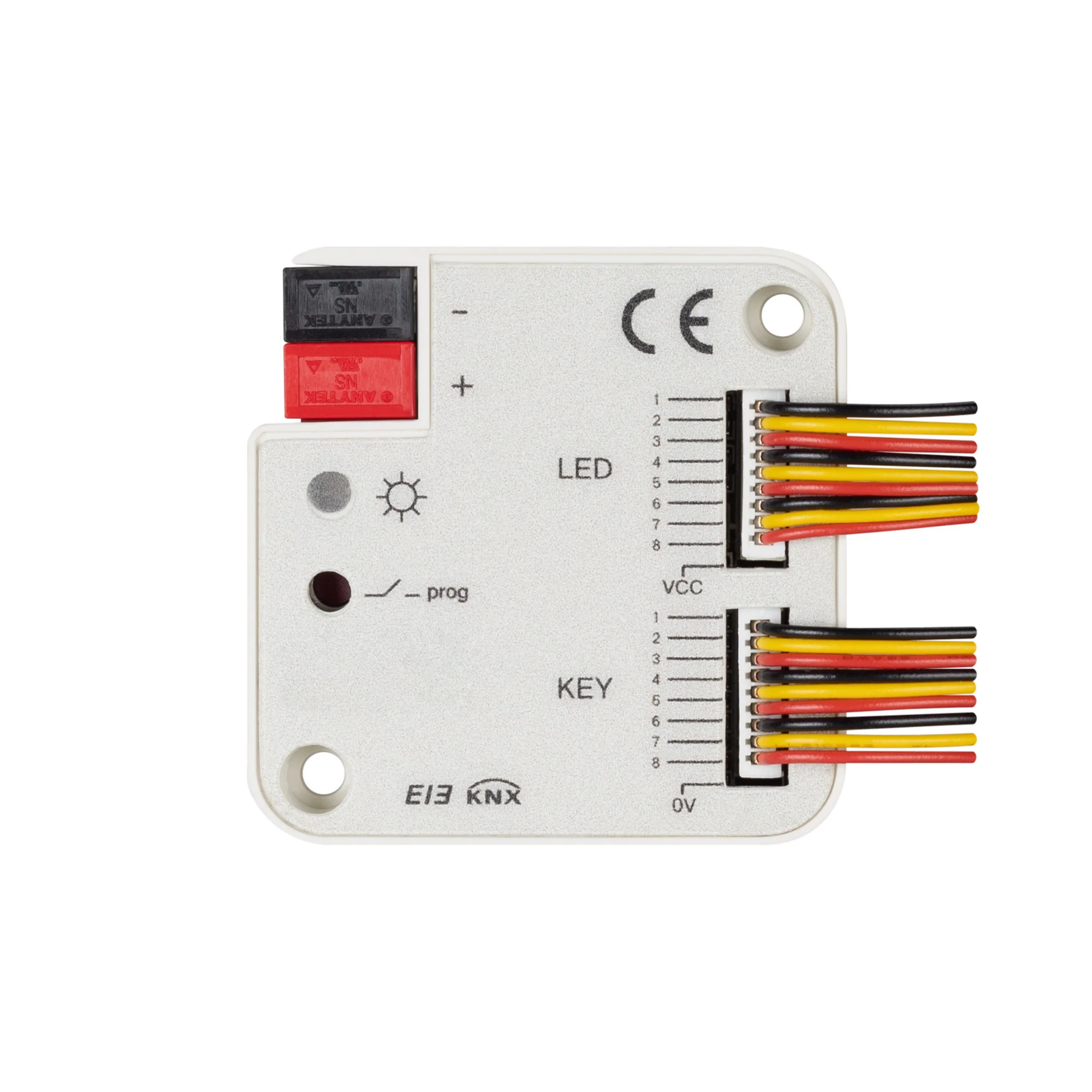 Конвертер KNX позволяет подключить выключатели и датчики с выходом «сухой контакт» любых производителей. 8 входов. Установка в подрозетник. Питание DC 21-30V от шины данных. 8 выходов на индикаторы 1 мА. Размер 46×46×11.7 мм.