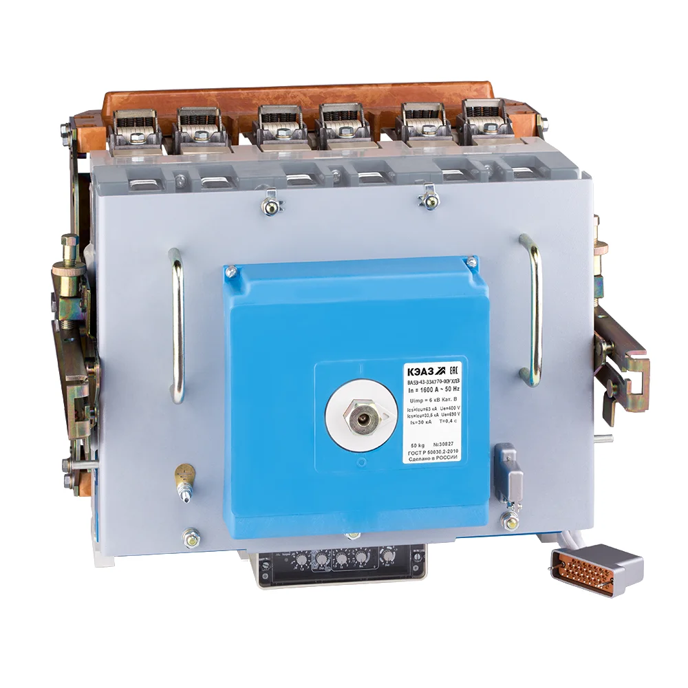 Блочный автоматический 3 полюсный выключатель переменного тока с предельной коммутационной способностью при переменном токе 63 кА на номинальный ток 1600 А .
