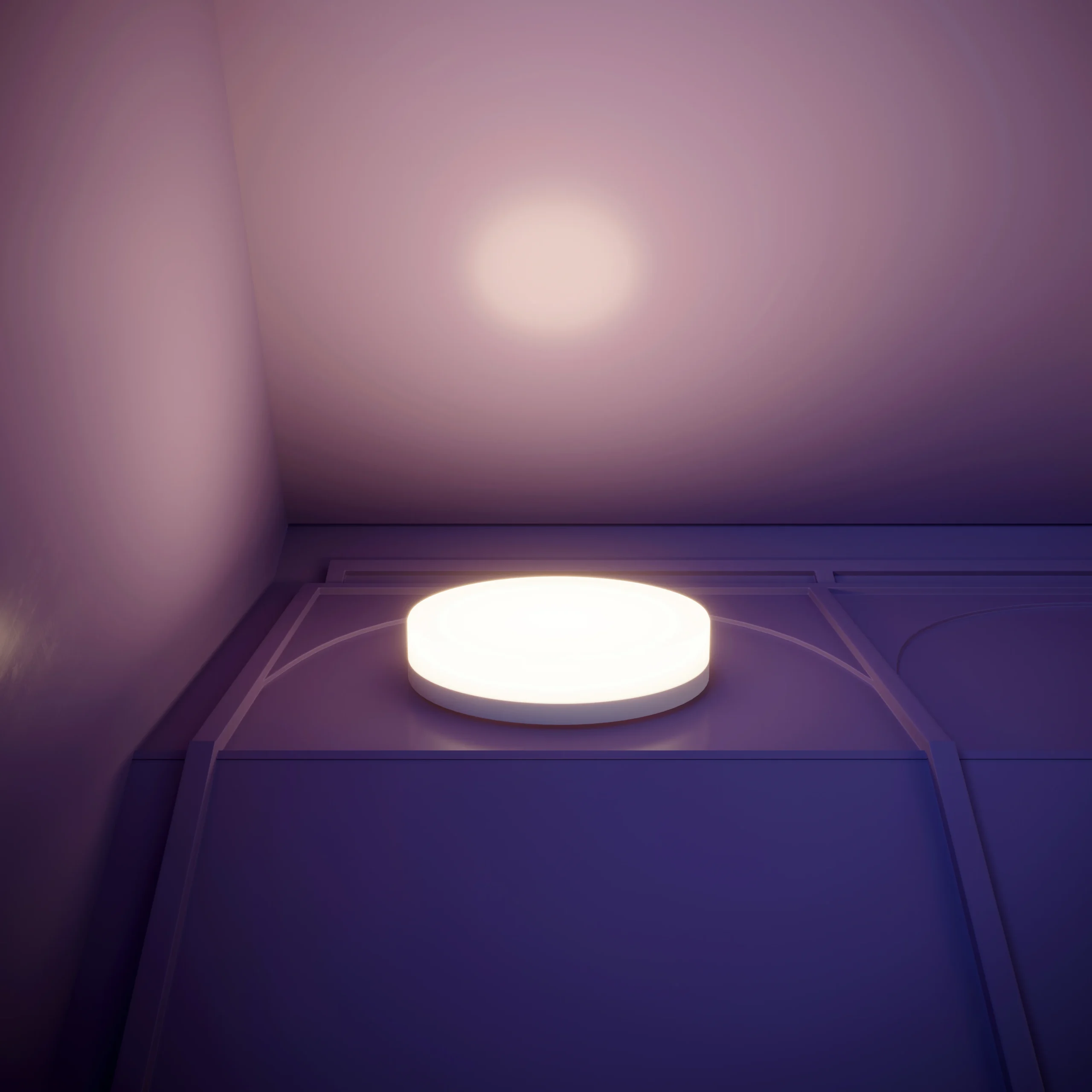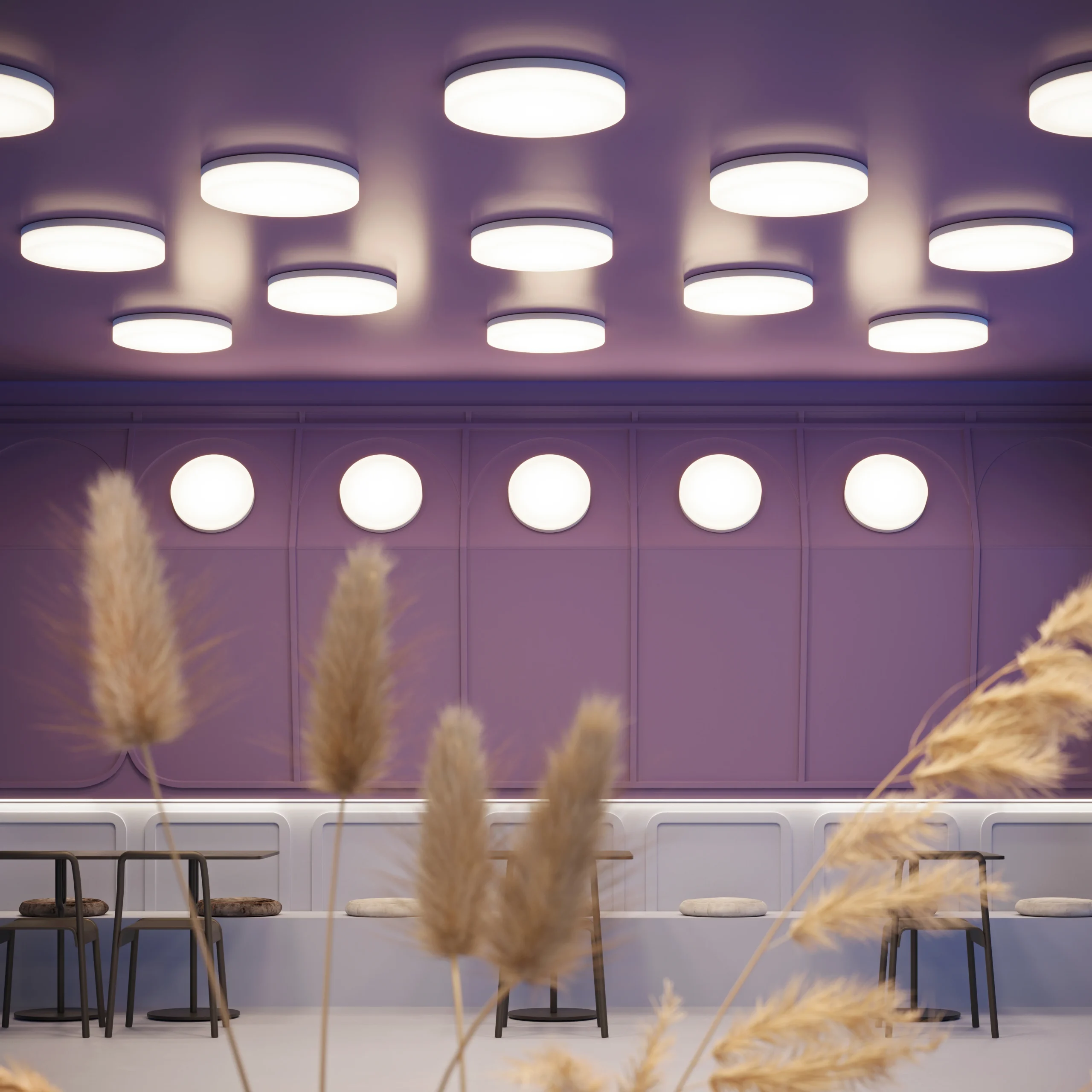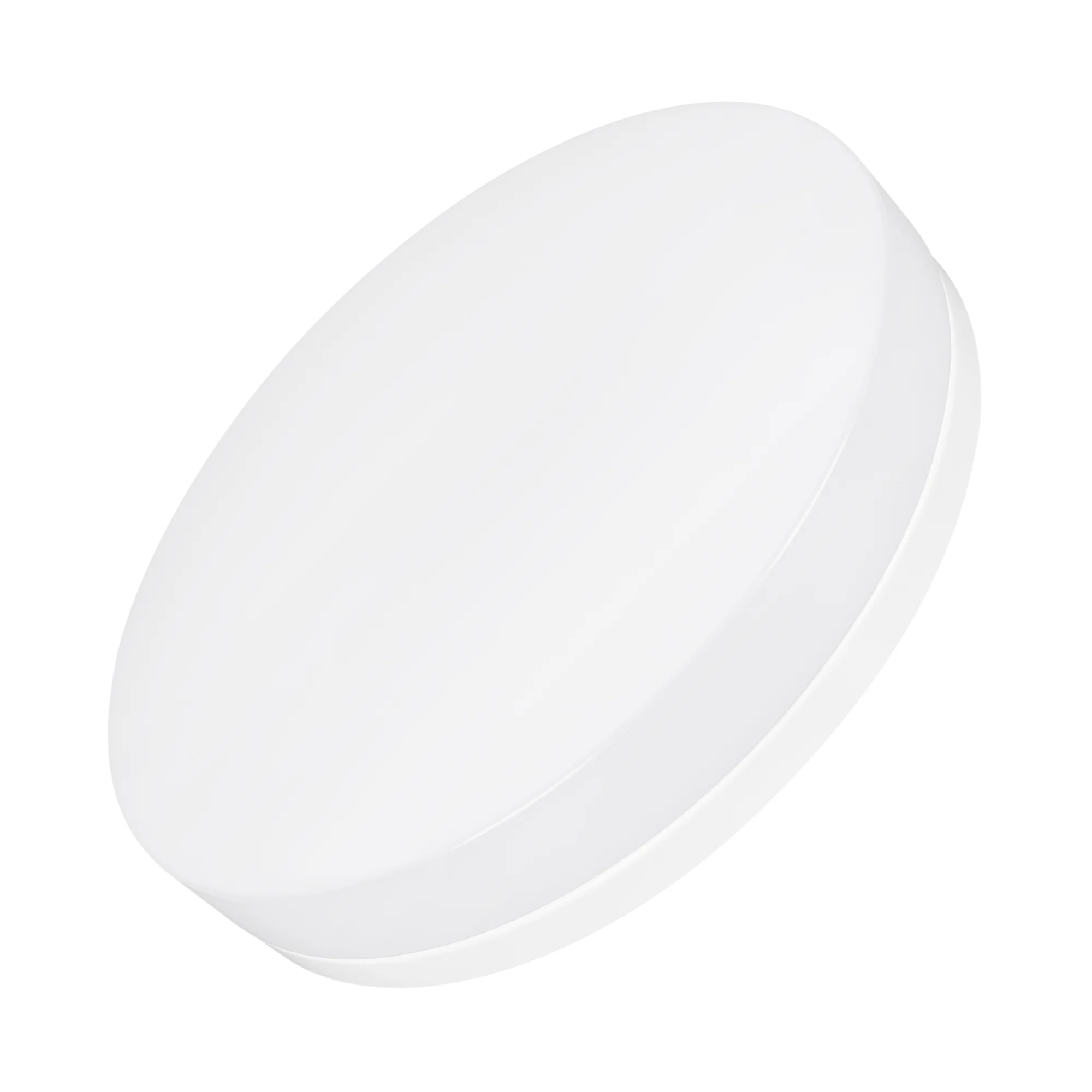 Накладной светильник с изменяемой цветовой температурой. Мощность 30 Вт, св. поток 2400-2900 лм, 100 лм/Вт, теплый 3000 K, дневной 4000K, белый 6000K, CRI>80, угол 140°, напряжение питания 230 В. Белый круглый корпус из металла, рассеиватель из поликарбоната, степень защиты IP40. Размер: диаметр 397 мм, высота 83 мм. Монтаж накладной, Драйвер встроенный, пульсация <1%.