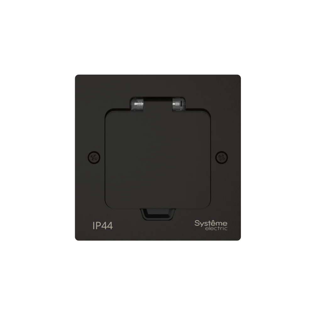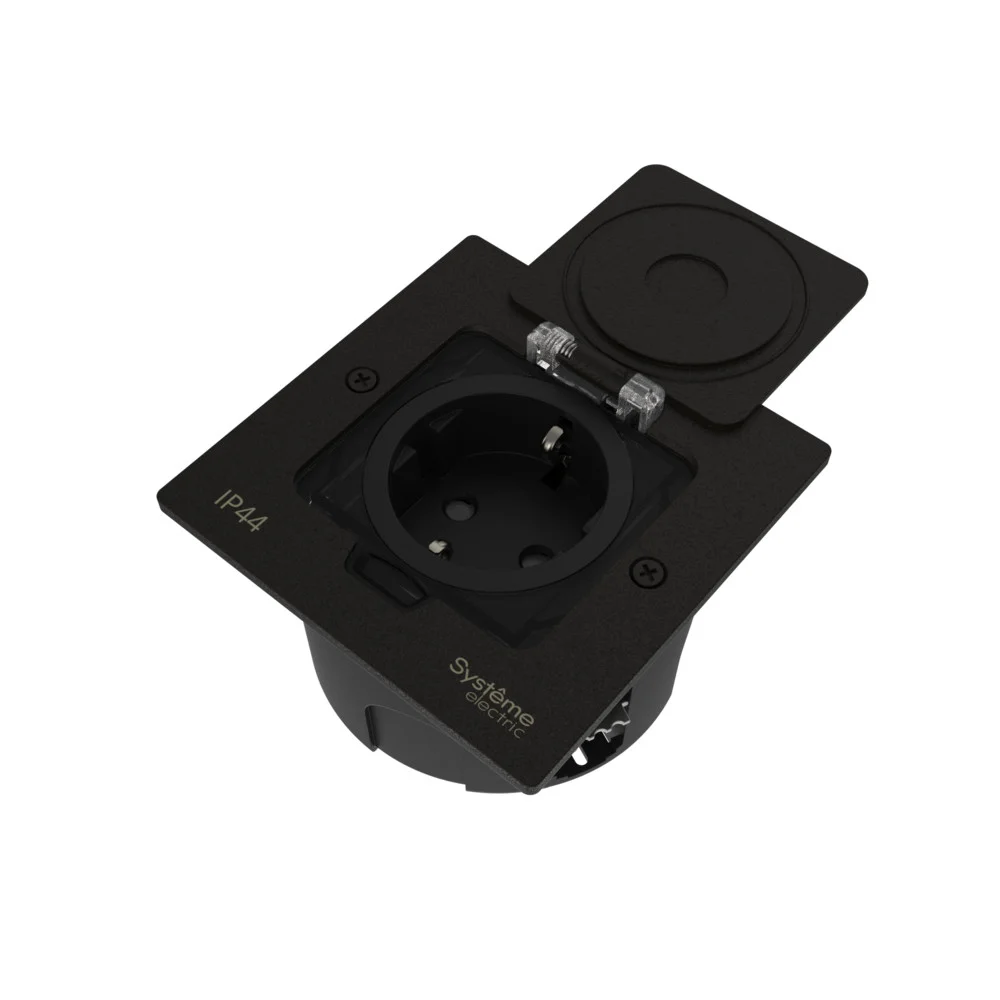 Systeme Elecrtic MultiDesk Чёрный матовый Лючок с розеткой 2К+З, 16А/250В, IP44 с монтажной коробкой для стены, фальшпола, стола , тип