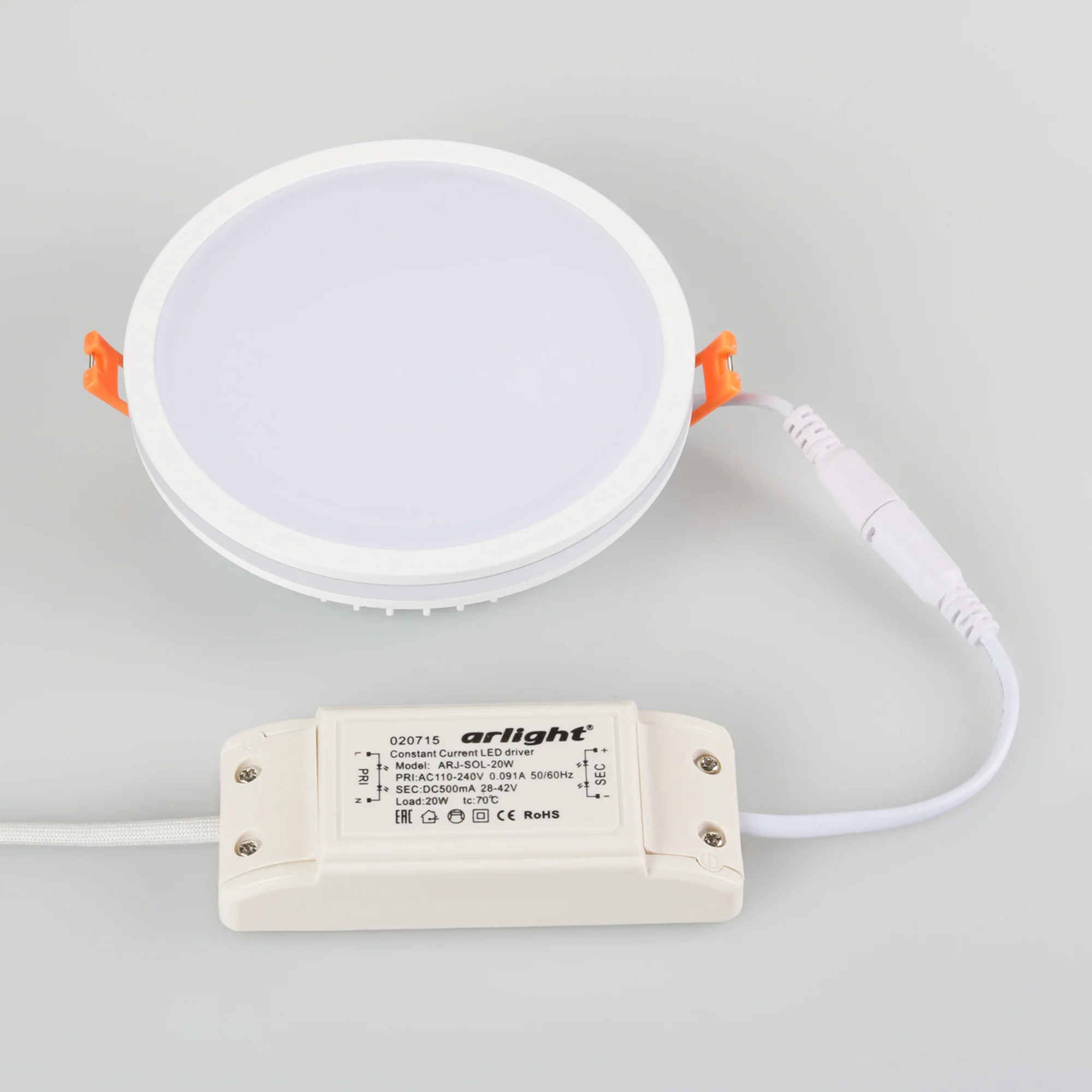 Круглый светильник с контурным свечением. Корпус IP44 белый + вставка поликарбонат PC. Цвет ТЕПЛЫЙ БЕЛЫЙ 3000К, св.поток 1400-1600 лм, угол 120°+180°. Питание 180-240VAC, 20Вт. Драйвер в комплекте 500mA 28-42V. Размеры 135х40 мм, установка в отв.125 мм, высота мин.40 мм.