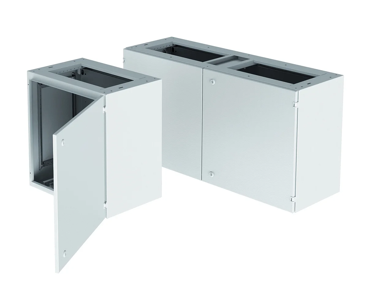 Используется для комбинирования пультов управления. На дверях и внутри корпуса предусмотрены заземляющие соединения. Угол открывания дверей 180 гр. Двустворчатые двери можно поменять местами. Монтажная панель с С-образной окантовкой по бокам, выполнена из оцинкованной стали.
