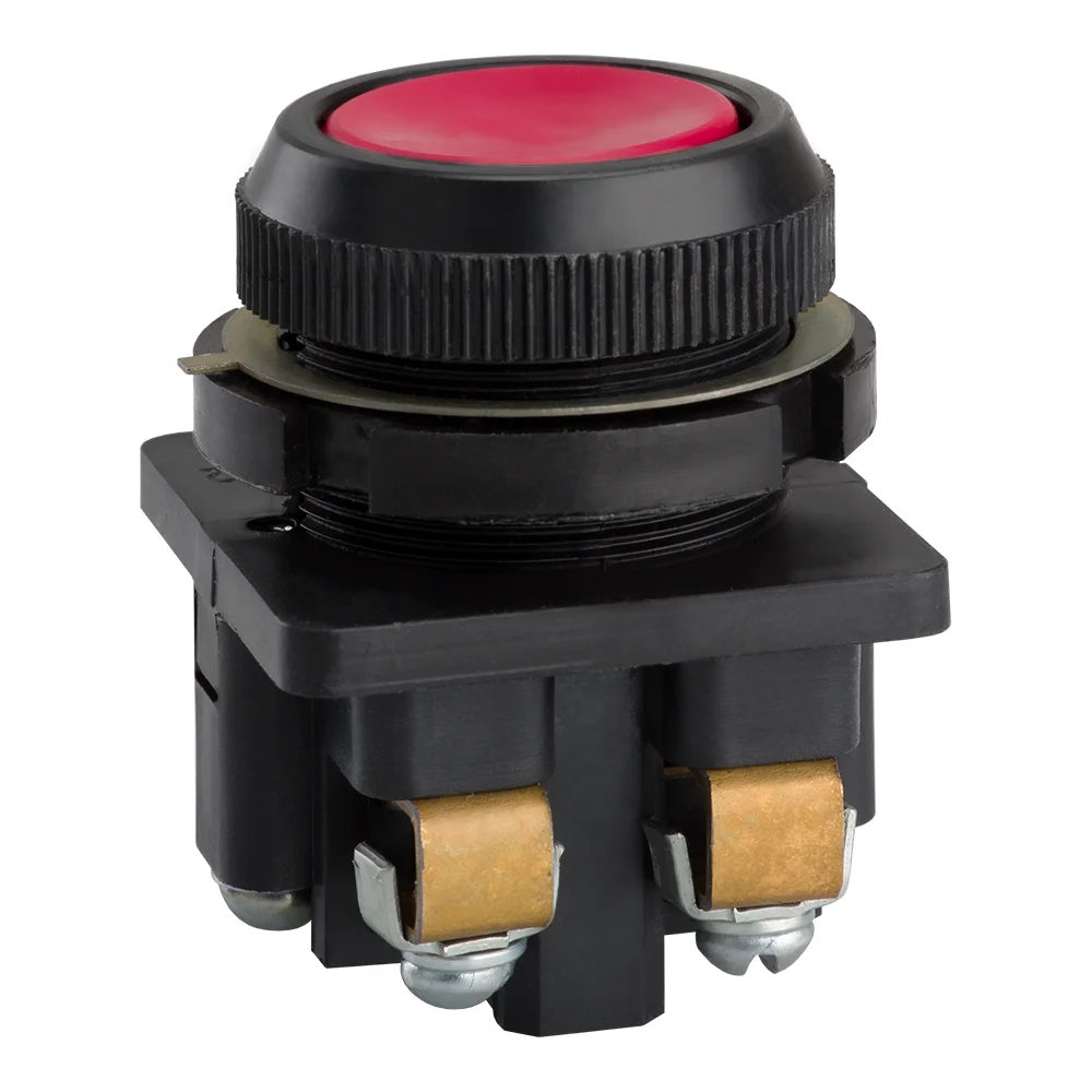 Кнопочный пост шириной 74 мм, высотой 74 мм и глубиной 54 мм, в котором толкателем выступает красная кнопка .