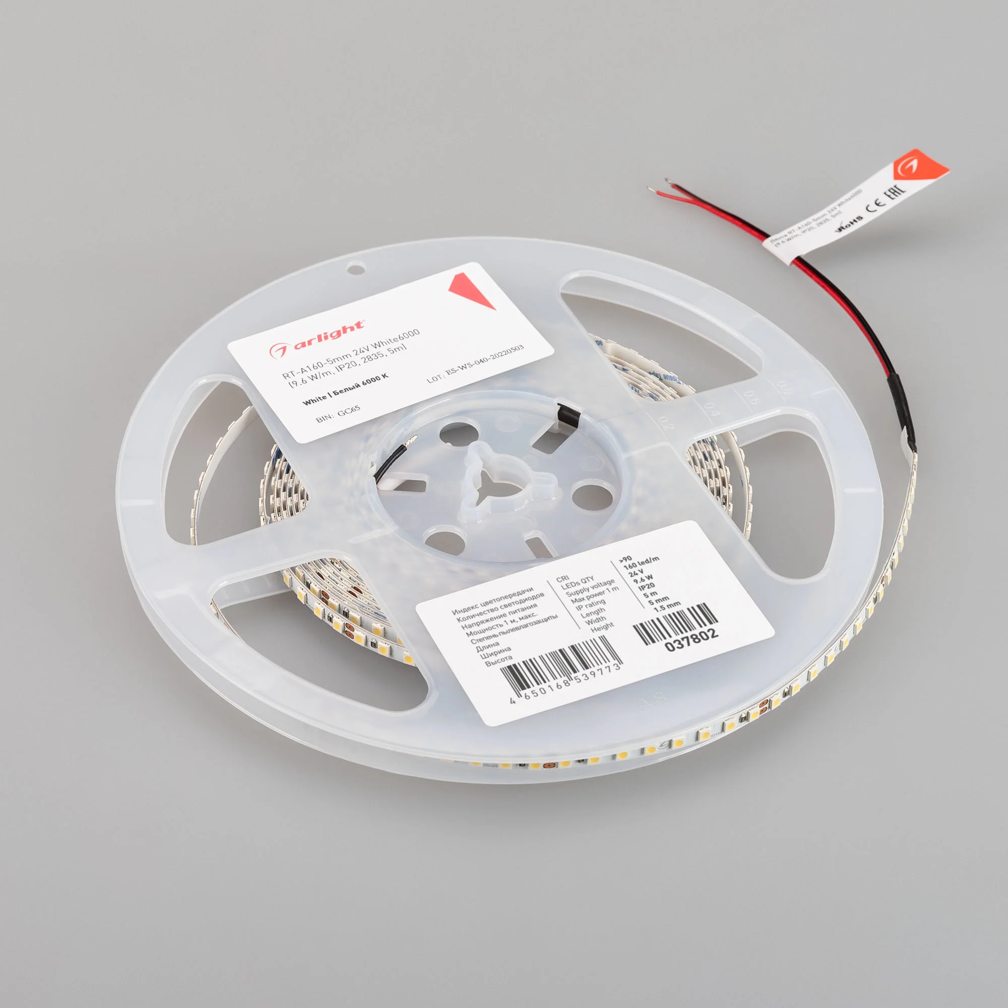 Светодиодная узкая лента RT серии A120 Светодиоды SMD 2835, 120 шт/м, белая плата шириной 5 мм, скотч 3M. Цвет БЕЛЫЙ 6000K, индекс цветопередачи CRI>85, угол 120°. Питание 24 В, мощность 9.6 Вт/м (48 Вт на 5 м). Размеры 5000x5x1.5 мм. Мин. отрезок 50 мм, 6 светодиодов. Цена за 1 м. Кратность заказа поставщику: 5 м.
