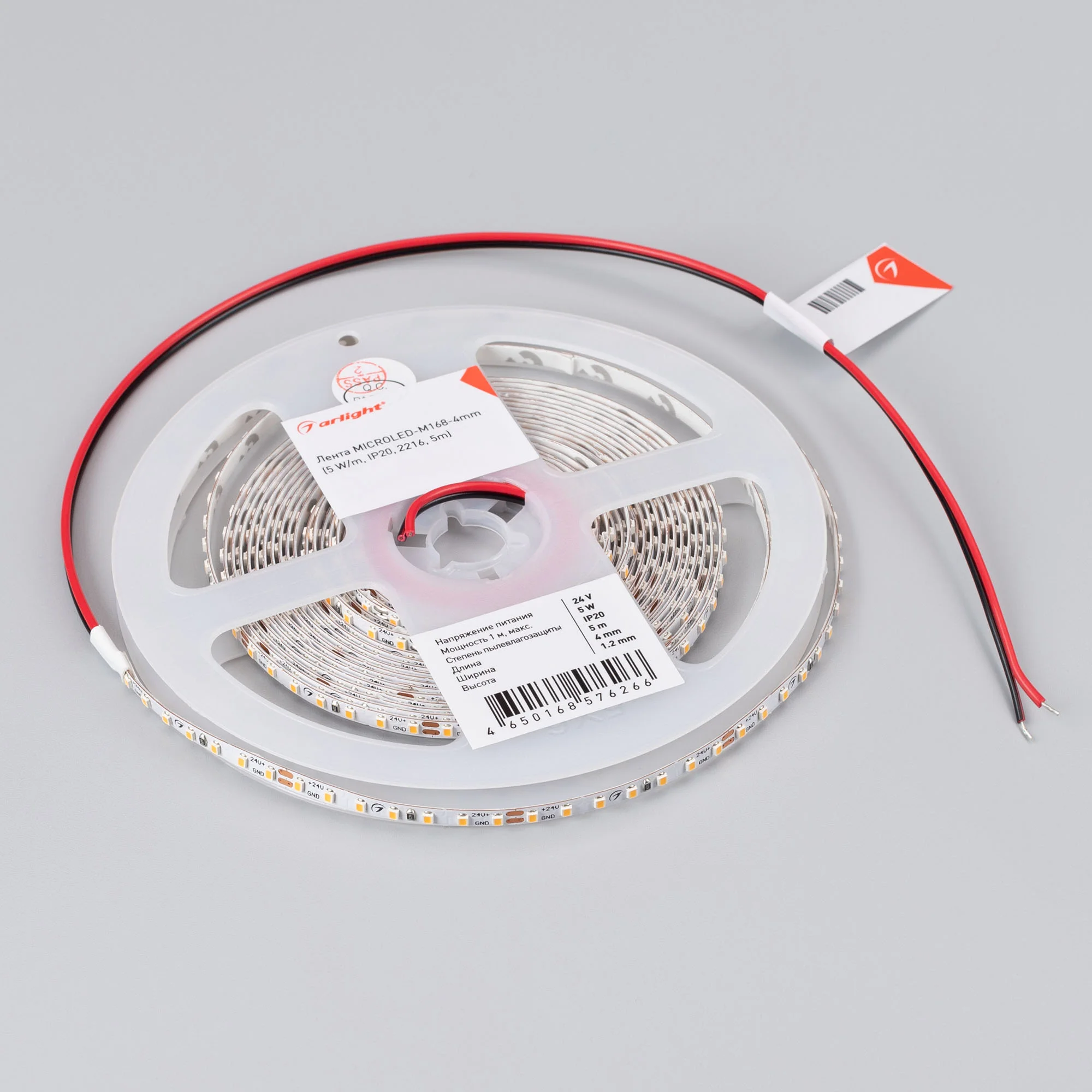 Светодиодная узкая лента MICROLED серии M168. Светодиоды SMD 2216, 168 шт/м, белая плата шириной 4 мм, скотч 3M. Цвет ТЕПЛЫЙ 3500K, индекс цветопередачи CRI>90, угол 120°. Питание 24 В, мощность 5 Вт/м (25 Вт на 5 м). Размеры 5000х4х1.2 мм. Мин. отрезок 41.67 мм, 7 светодиодов. Цена за 1 м. Кратность заказа поставщику: 5 м.