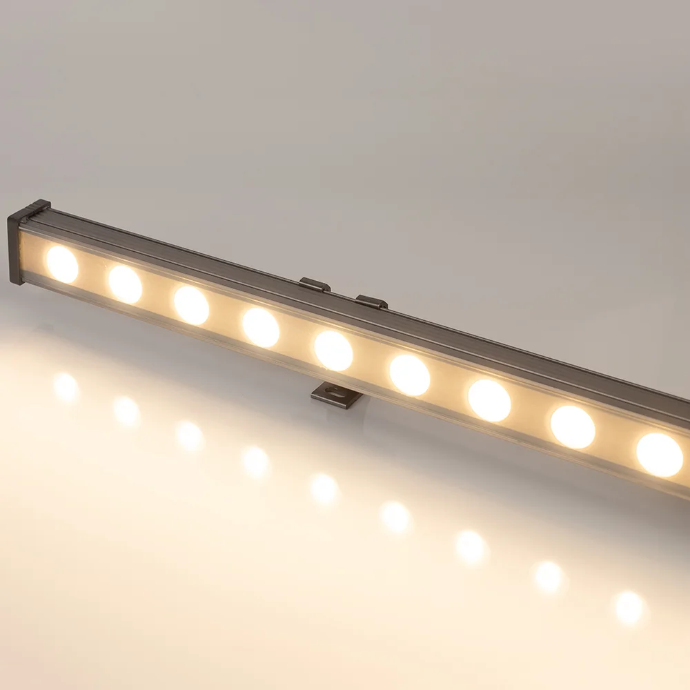 Линейный прожектор. Мощность 24 Вт, св. поток 1850 лм, 77 лм/Вт, тёплый 3000 K, CRI>80, угол 15°, напряжение питания 230 В. Серый прямоугольный корпус из алюминия, экран стекло, степень защиты IP65. Размер: длина 1000 мм, ширина 40 мм, высота 30 мм. Монтаж на кронштейнах.