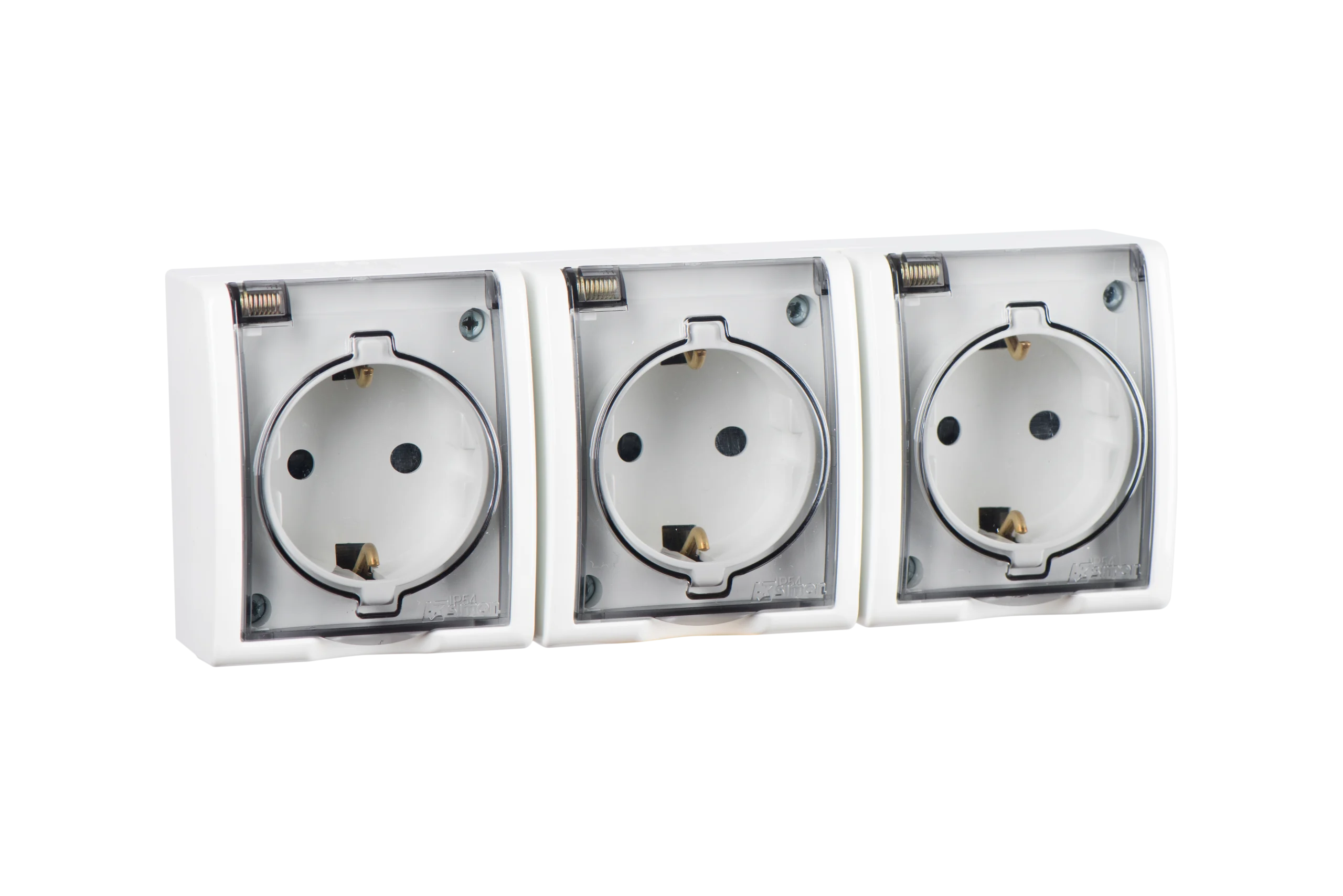 Розетка Systeme Electric (ранее Schneider Electric) ЭТЮД (кремовый, открытой установки) трёхместная со шторками, без заземления предназначена для применения в сетях до 250В, на ток до 16А. Трёхместная розетка позволяет подключить три устройства в одном месте. Шторки обеспечивают дополнительную безопасность в доме, где находятся дети. Сделано в России.