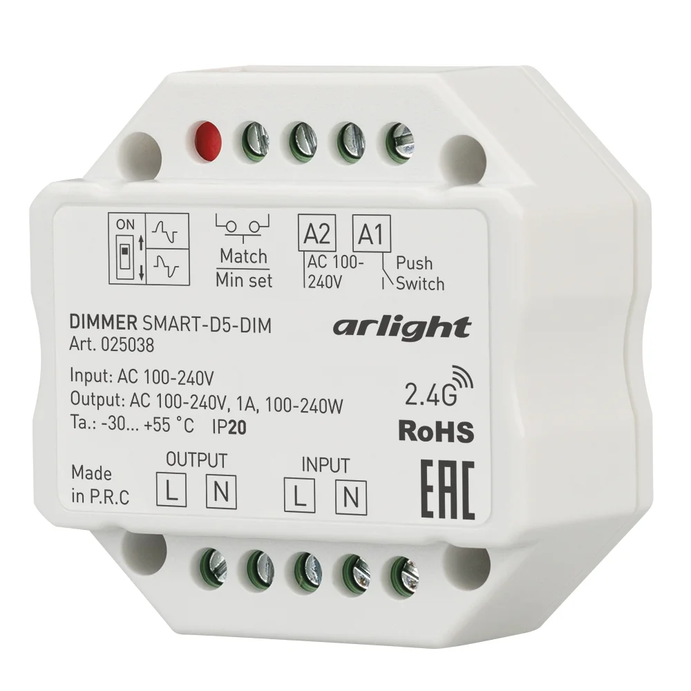 Arlight Диммер SMART-D5-DIM-IN (230V, 1A, TRIAC, 2.4G) (IP20 Пластик, 5 лет)
