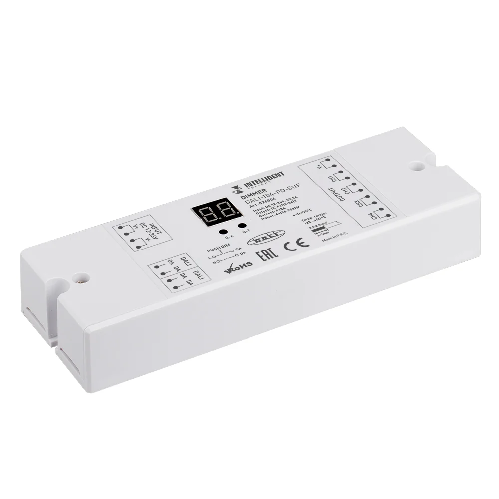 Диммер DALI (DT6) для RGBW светодиодных лент. 4 адреса устройства, 4 канала управления. Питание/выход DC 12-24V, ток нагрузки 4x5A, максимальная суммарная мощность нагрузки 240-480W. На корпусе цифровой дисплей. Габариты 110х67х48 мм. Цвет корпуса чёрный. Для использования на DIN-рейке.