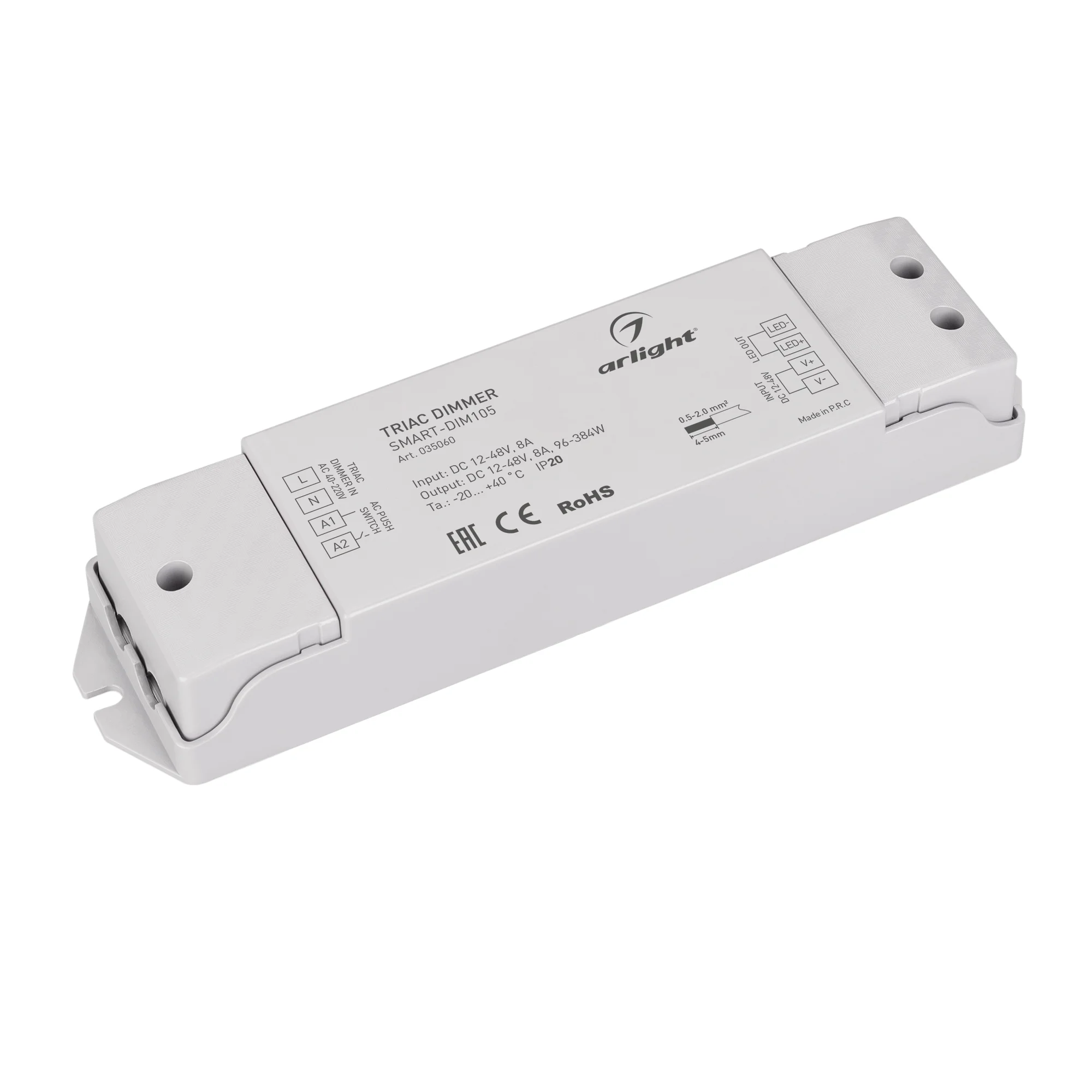 Диммер TRIAC для светодиодных лент. Сигнал управления TRIAC 100-240VAC, питание/рабочее напряжение 12-48VDC, максимальный ток 8A, максимальная мощность 96-384W. Винтовые клеммы. Корпус — PVC. Габариты 175x45x27 мм. Управляется стандартными светорегуляторами TRIAC по переднему фронту (LE).