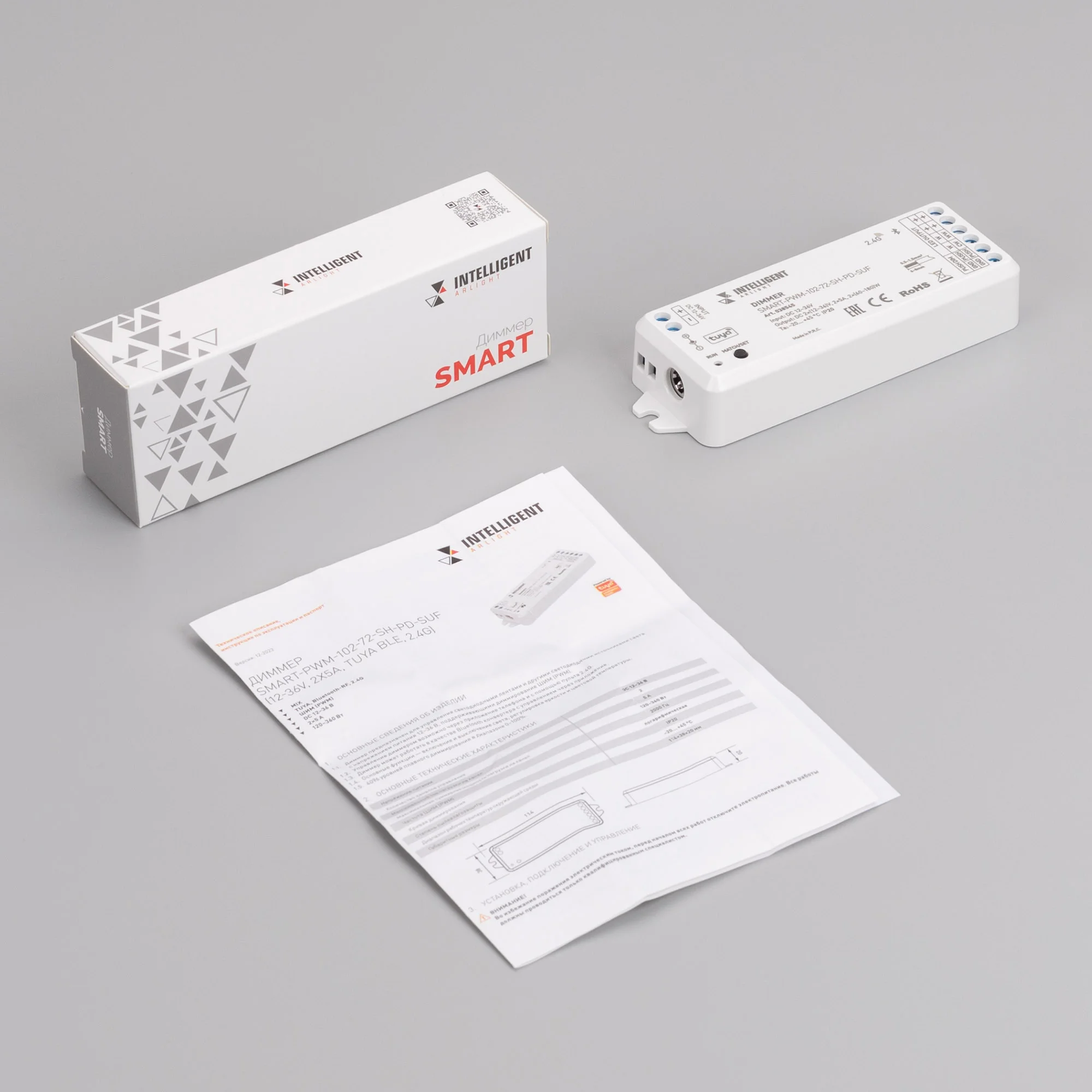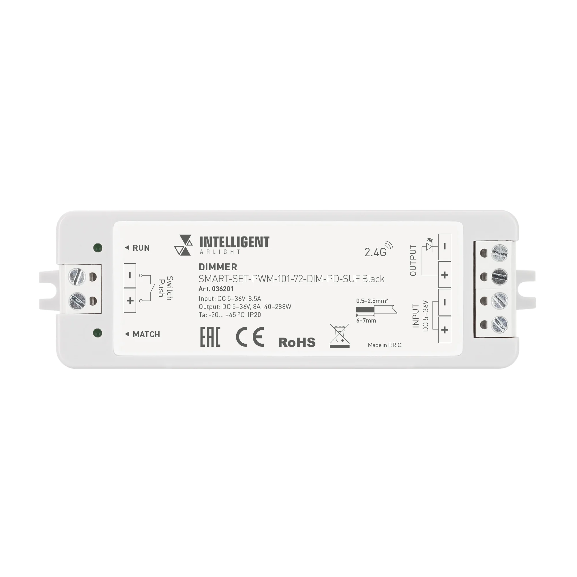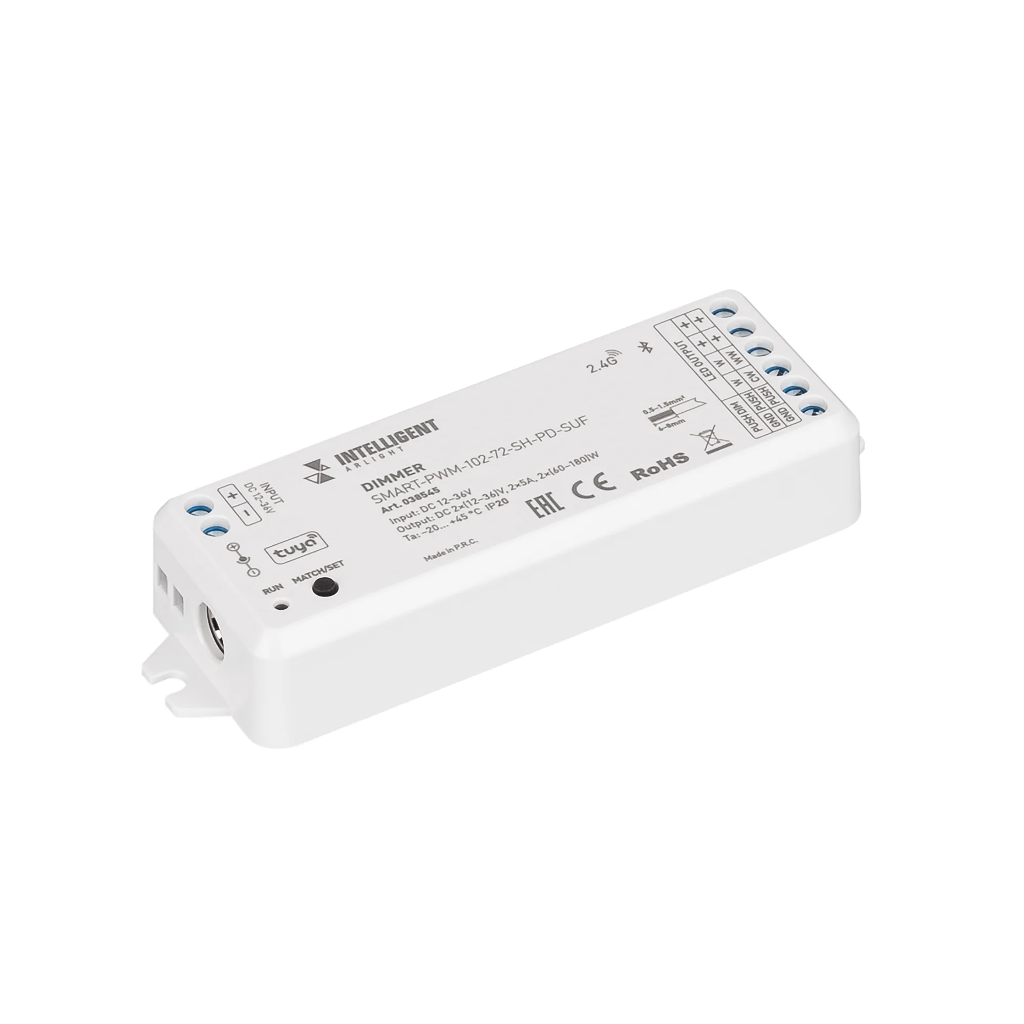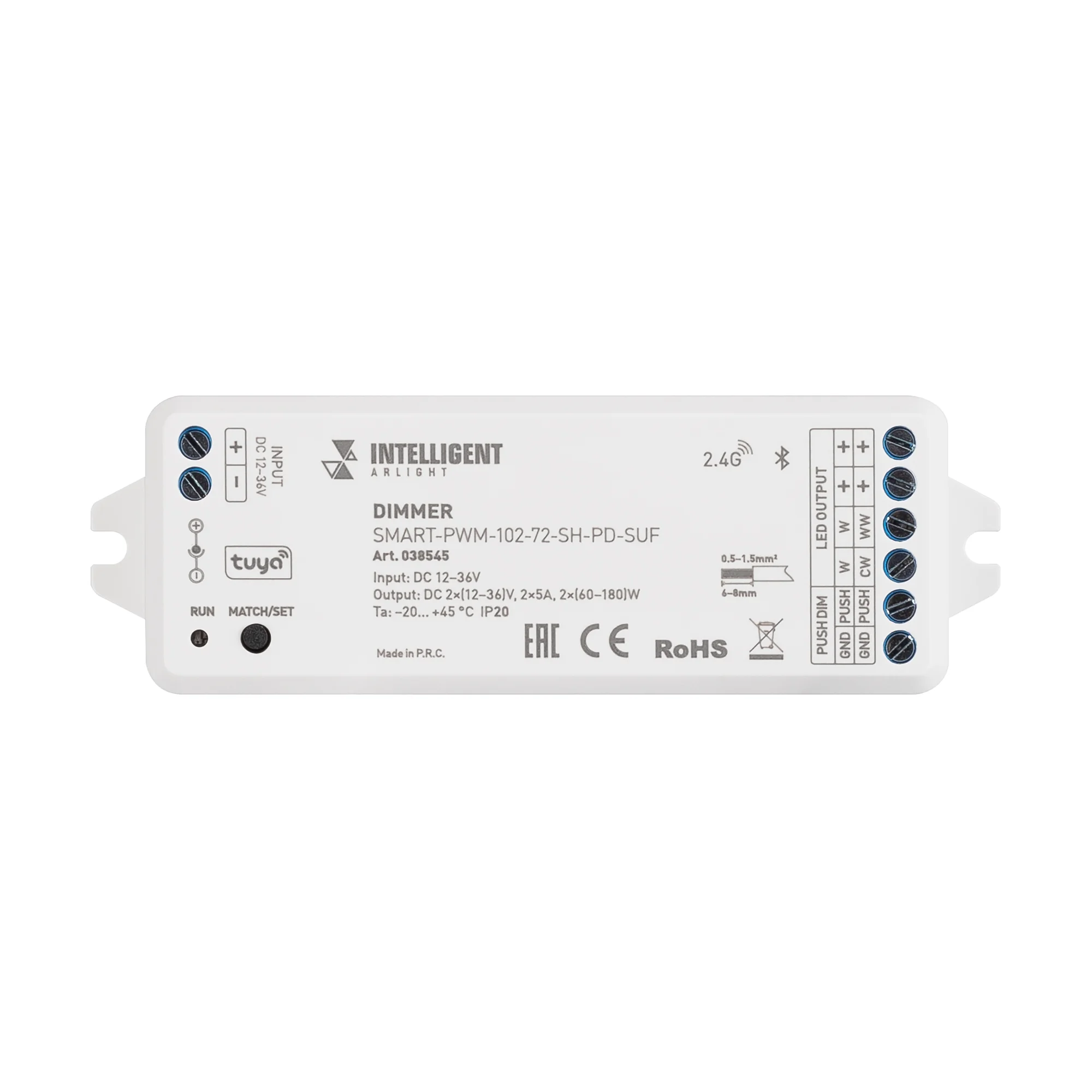2-канальный многофункциональный контроллер для светодиодных DIM и MIX лент и модулей (ШИМ). Интерфейсы: 2.4G, Bluetooth (SIG MESH), TUYA. Совместимость: пульты и панели SMART, с приложениями INTELLIGENT ARLIGHT, Умный дом с Алисой, Салют. от Sber (через Bluetooth-WiFi конвертер). Питание: 12–36V DC. Каналы/ток/мощность: 2 канала, макс. 5A на канал, макс. 120–360W. Исполнение: винтовые клеммы, корпус PVC. Габариты: […]
