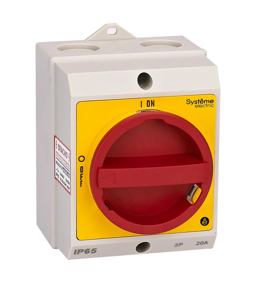 Выключатель-разъединитель MSD в корпусе IP65 на номинальный ток 20 А. Может использоваться в качестве главного аварийного выключателя. Применяется для коммутации силовых электрических цепей активной, индуктивной или смешанной нагрузок, может использоваться для включения и отключения двигателей категорий применения AC–3 и DC–3. 3-полюсное исполнение, красная поворотная рукоятка с возможностью блокировки навесными замками.