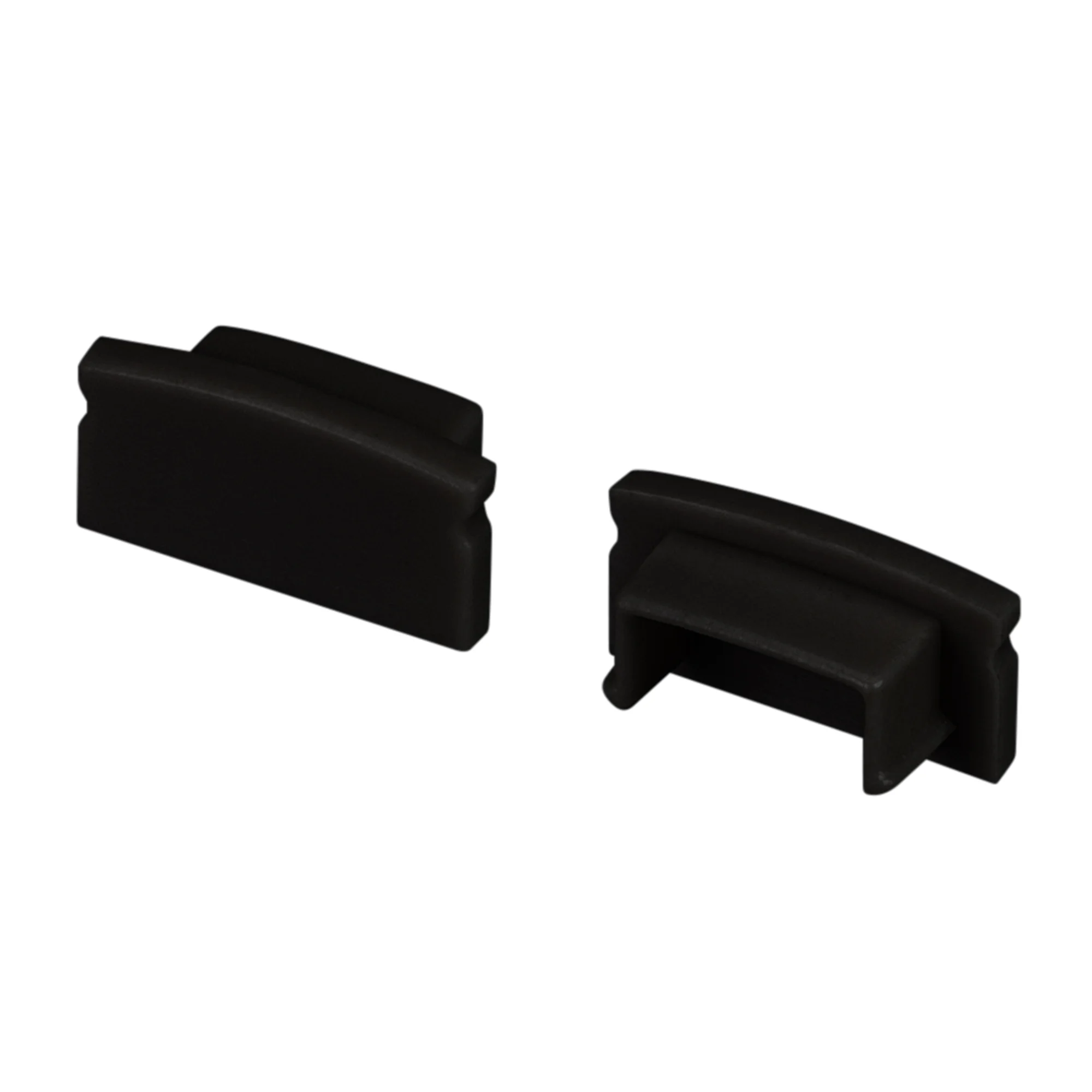 Пара заглушек (правая — с отверстием, левая — без отверстия) для профиля SL-BEVEL-H10-F14 BLACK. Цвет — черный. В комплекте 2 заглушки. Цена за комплект.