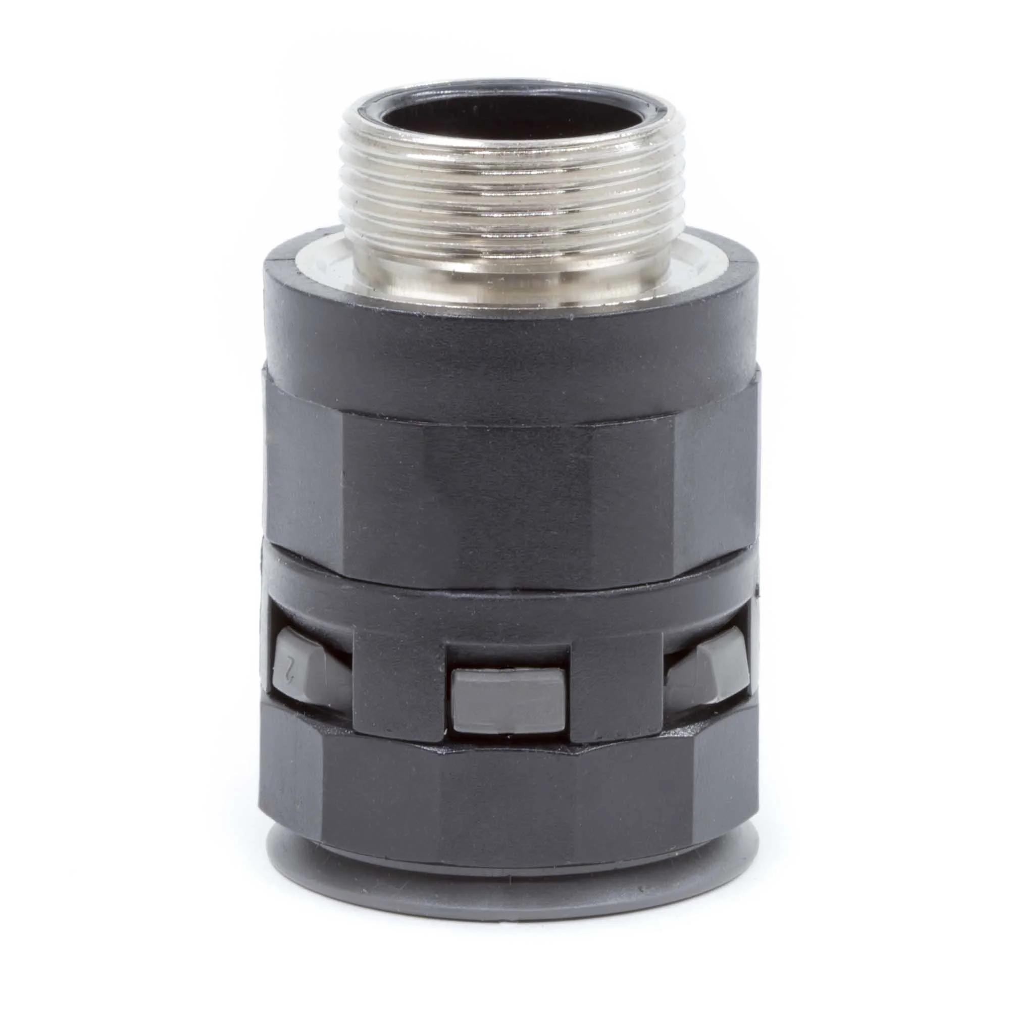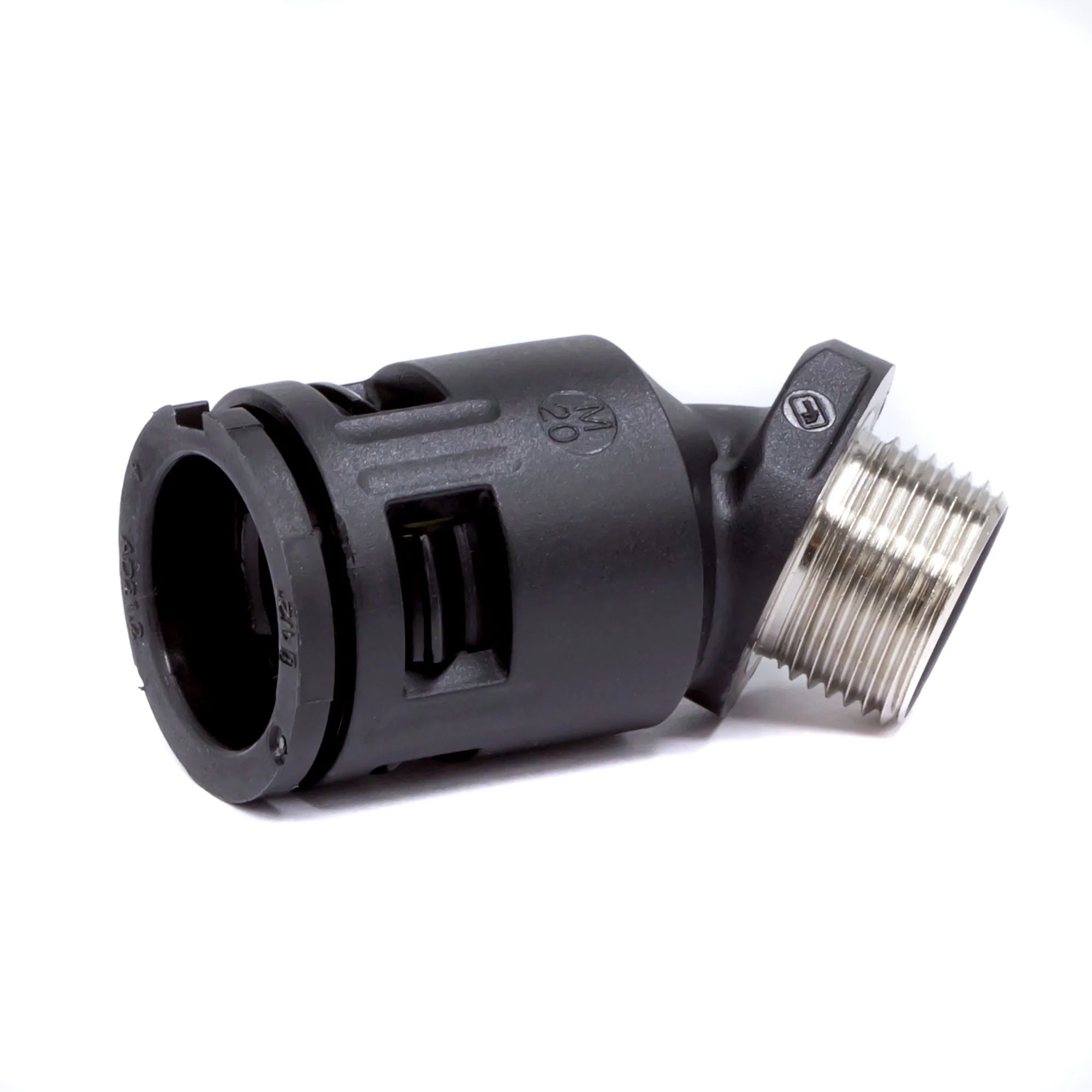 Муфта предназначена для ввода гофрированных полиамидных труб номинальным диаметром 23мм под углом 45° в корпуса шкафов, щитков, распаечных коробок, которые подвергаются механическим и вибрационным воздействиям в процессе эксплуатации. Металлическая резьба позволяет жестко зафиксировать муфту в оборудовании и не допустить разбалтывания соединения. Материал корпуса — полиамид, материал металлической резьбы — никелированная латунь. Не содержит галогенов.