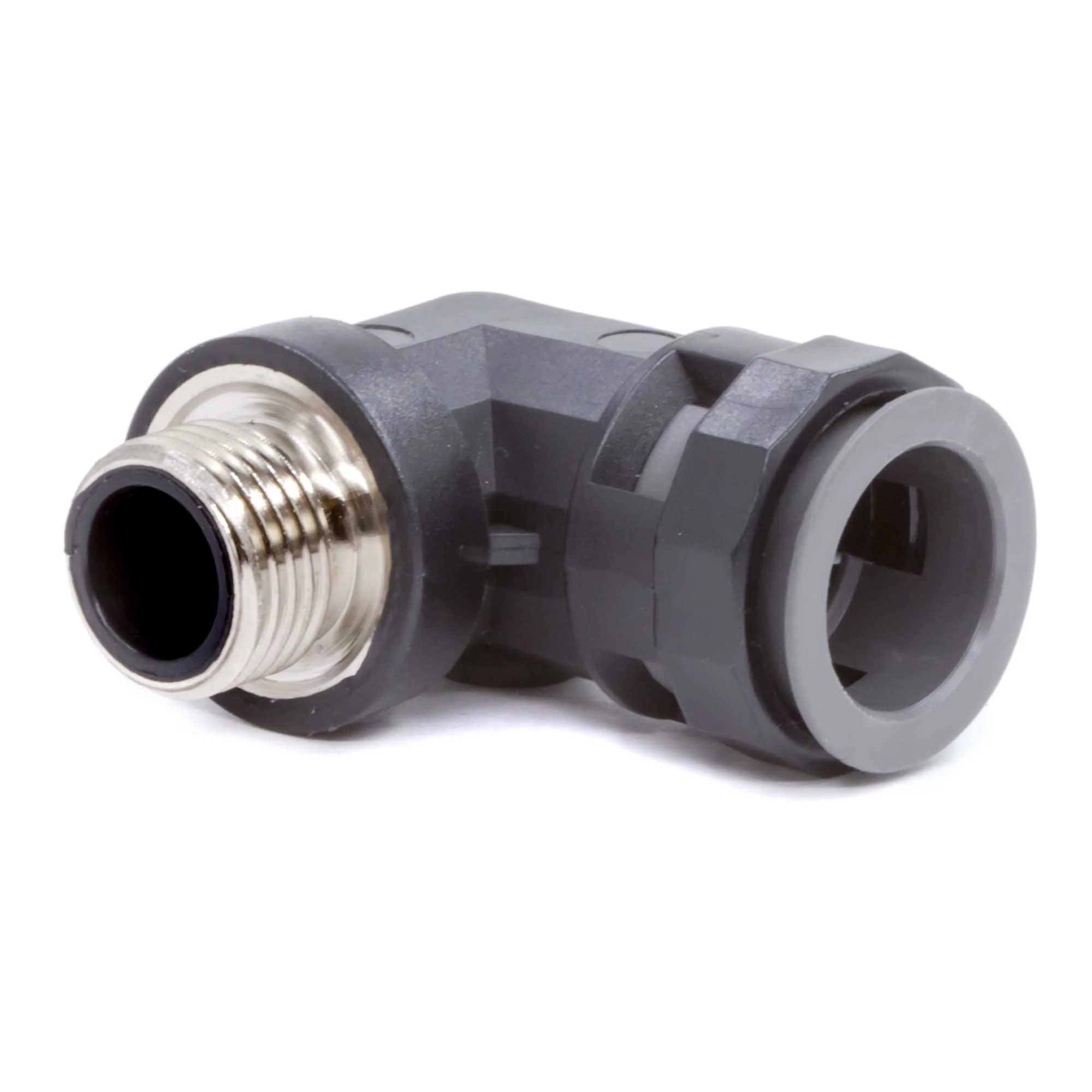 Муфта предназначена для ввода гофрированных полиамидных труб номинальным диаметром 10мм под углом 90° в корпуса шкафов, щитков, распаечных коробок, которые подвергаются механическим и вибрационным воздействиям в процессе эксплуатации. Металлическая резьба позволяет жестко зафиксировать муфту в оборудовании и не допустить разбалтывания соединения. Материал корпуса — полиамид, материал металлической резьбы — никелированная латунь. Не содержит галогенов.