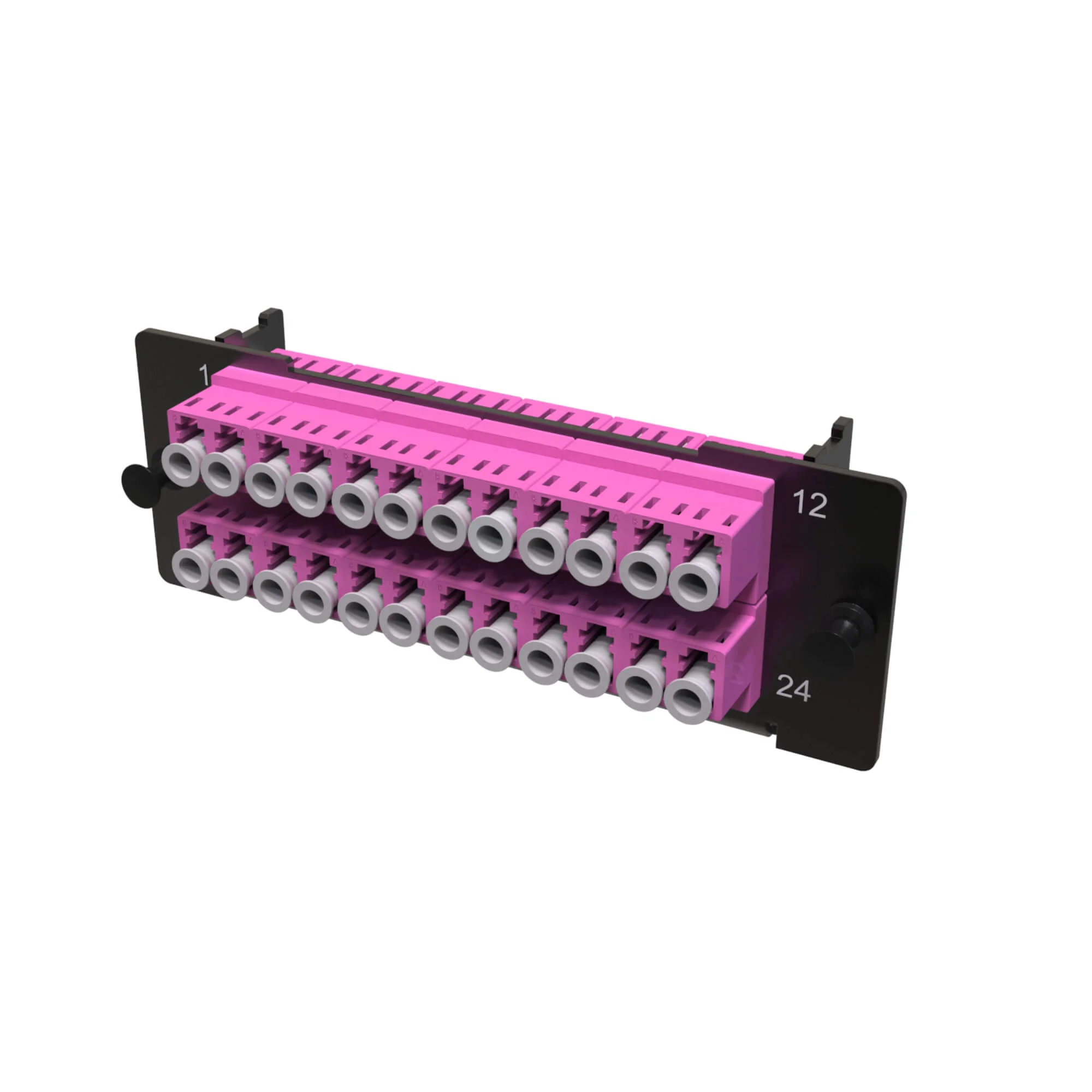 Адаптерная планка полной высоты (до 4 планок в корпус) с двенадцатью адаптерами LC Duplex OM4 (цвет адаптеров — пурпурный). Применяется для подключения оптических кабельных сборок 12xDuplex LC — 12xDuplex LC (код RNFLL124**) для организации магистральных оптических линий между коммутационными или серверными шкафами. Не требуют сварки волокон. Максимальная плотность коммутационного поля. Планки устанавливаются с лицевой стороны […]