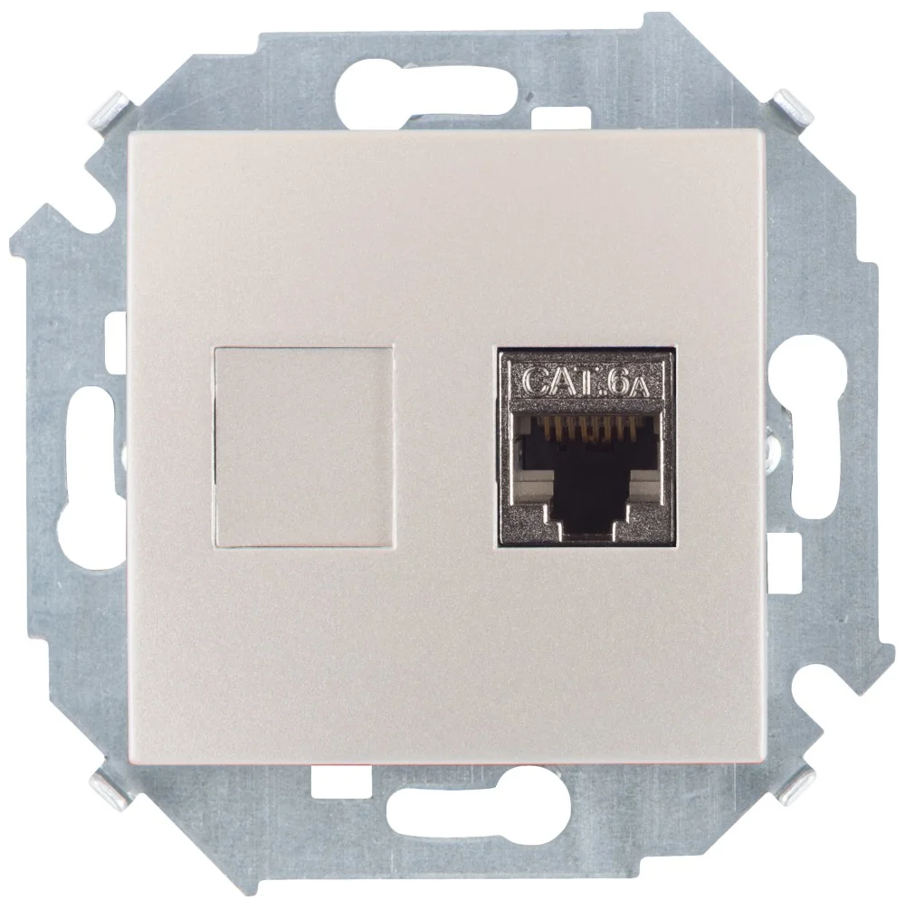 Компьютерная розетка. Назначение: подсоединение кабеля к компьютеру, принтеру и прочей оргтехнике. Характеристики: 8Р8С; комплектуются одномодульным гнездом; для заделки контактов в розетки использовать инструмент типа 110. RJ-45. Категория: 6, экранированная. Тип гнезда: Keystone. Производитель гнезда: ДКС Hyperline. Установочный размер: 45х25. Кол-во модулей: 1. Цвет: белый