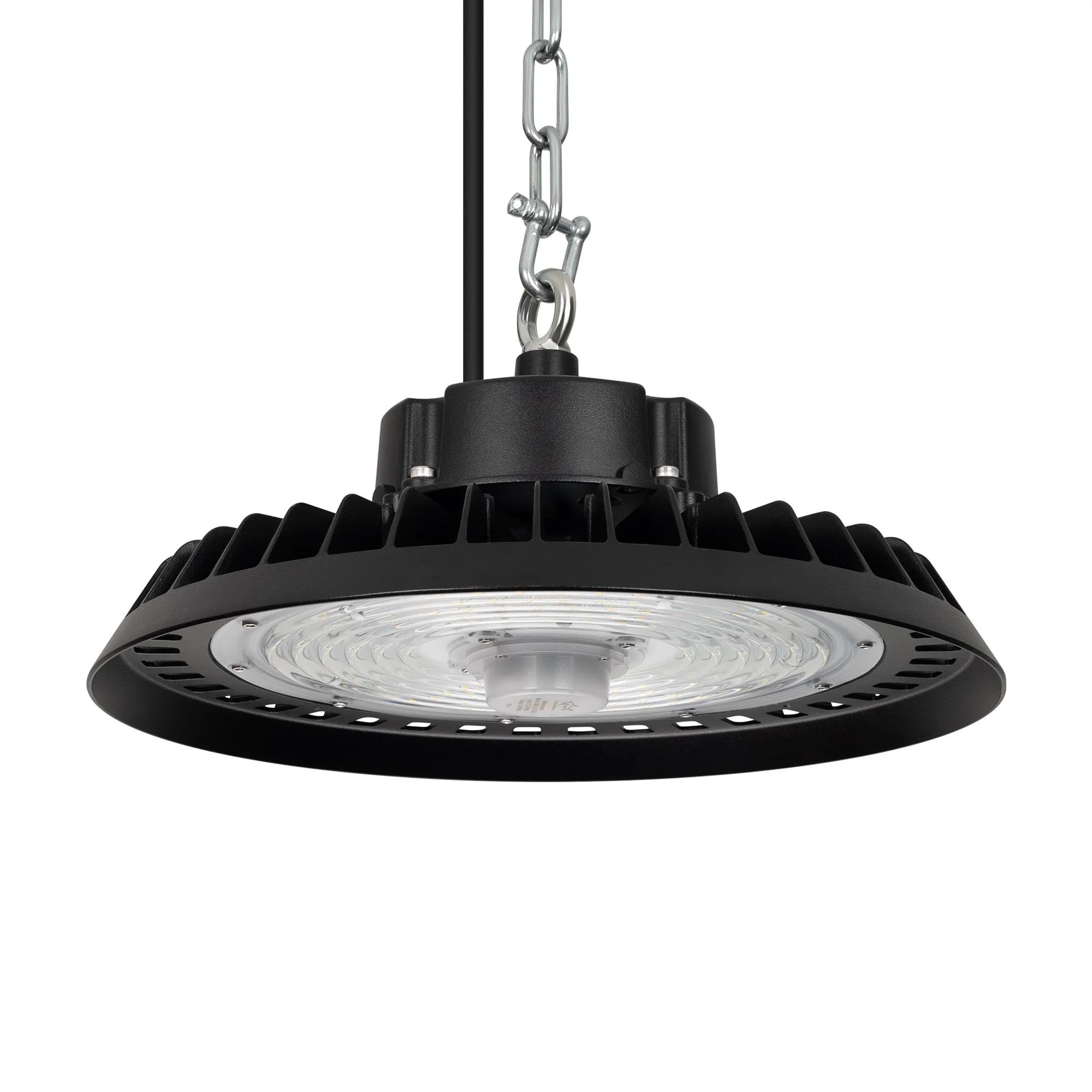 Светильник для освещения складских и промышленных помещений. Мощность 150W, напряжение питания AC 120-270V/50Hz. CRI 80. Тип светодиодов SMD2835, с групповой оптической линзой. Цвет свечения ДНЕВНОЙ 5000K, световой поток 22500 Lm, угол рассеивания 90°. Доступно управление по протоколу 0-10В. Цвет корпуса черный, линза из поликарбоната, степень влагозащиты IP65, ударопрочность IK08. Габариты Ф300xH140мм. Рым-болт в комплекте.