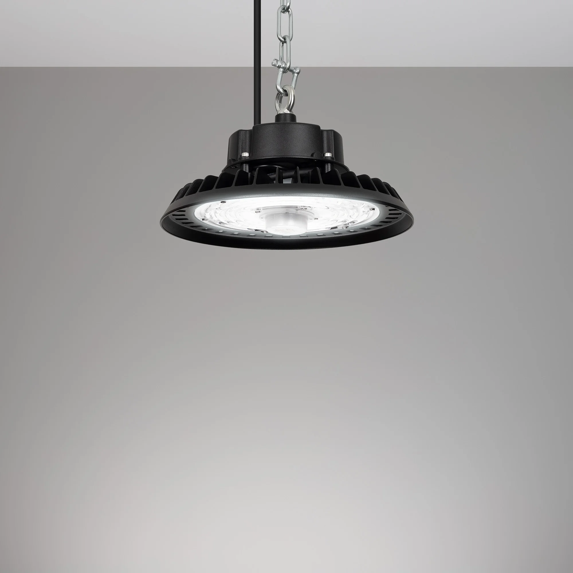 Светильник для освещения складских и промышленных помещений. Мощность 150W, напряжение питания AC 120-270V/50Hz. CRI 80. Тип светодиодов SMD2835, с групповой оптической линзой. Цвет свечения ДНЕВНОЙ 5000K, световой поток 22500 Lm, угол рассеивания 60°. Доступно управление по протоколу 0-10В. Цвет корпуса черный, линза из поликарбоната, степень влагозащиты IP65, ударопрочность IK08. Габариты Ф300xH140мм. Рым-болт в комплекте.