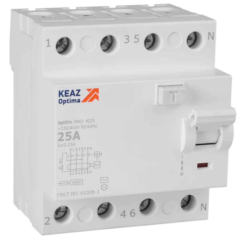 Двухполюсное устройство защитного отключения на номинальный ток 25 А, номинальный отключающий дифференциальный ток 10 мА и рабочее напряжение переменного тока 230 В.