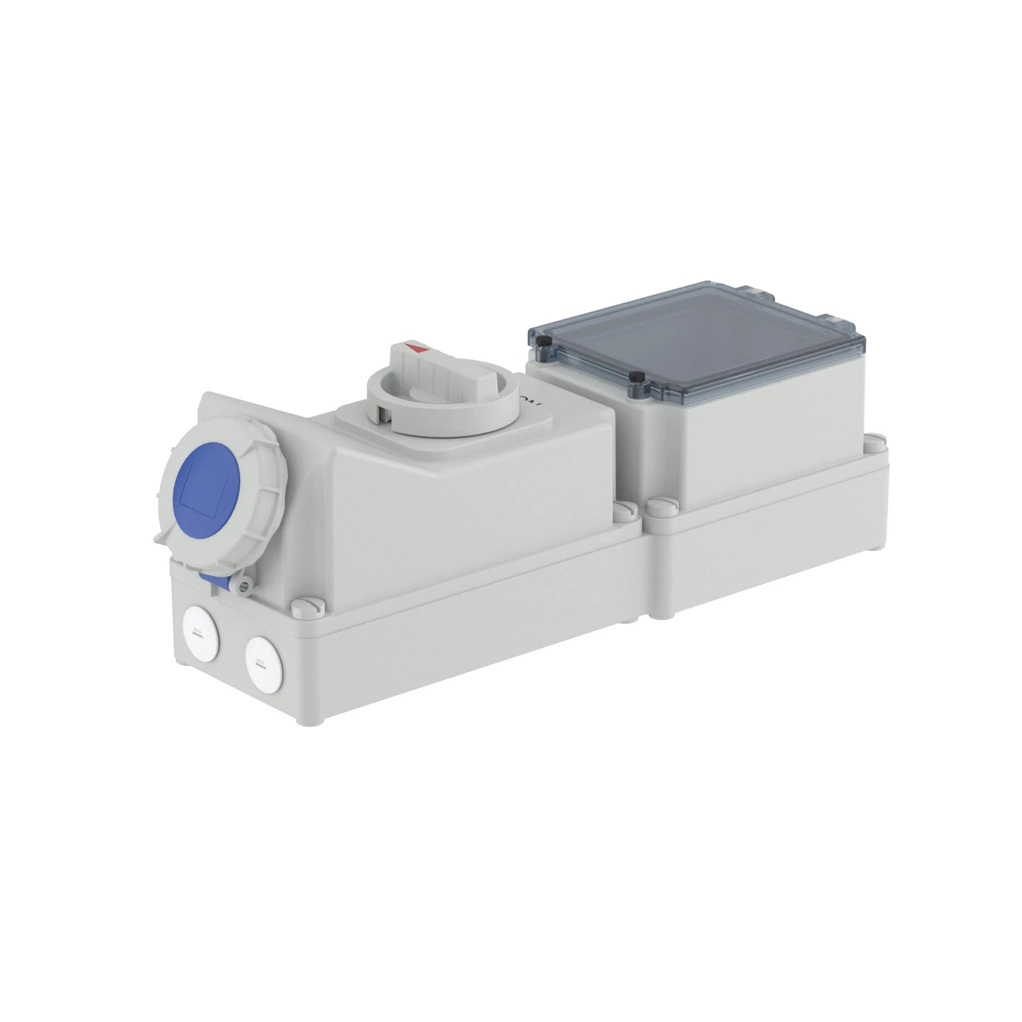 Розетка настенного типа с механической блокировкой, с возможностью установки модульного оборудования. Применяется для организации точки подключения повышенной безопасности. Предотвращает подачу питания при отсутствии нагрузки и разъединение контакта под нагрузкой. Рассчитана на рабочее напряжение номиналом 230В; ток — 16А; степень защиты — IP66/67; контакты — 2P+E; GWFI +960°С; цвет — синий. Розетка имеет винтовой зажим. Промышленные […]