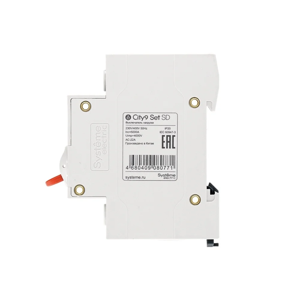 Выключатель-разъединитель серии City9 Set Systeme Electric, 1-полюсный, номинальный ток 40 А, с красной рукояткой управления. Предназначен для включения и отключения нагрузок в электрических сетях напряжением 230 В. Категория применения AC-22A. Двойной разрыв цепи обеспечивает гарантированное отключение питания и отсутствие сваривания контактов. Крепление на DIN-рейку шириной 35 мм.