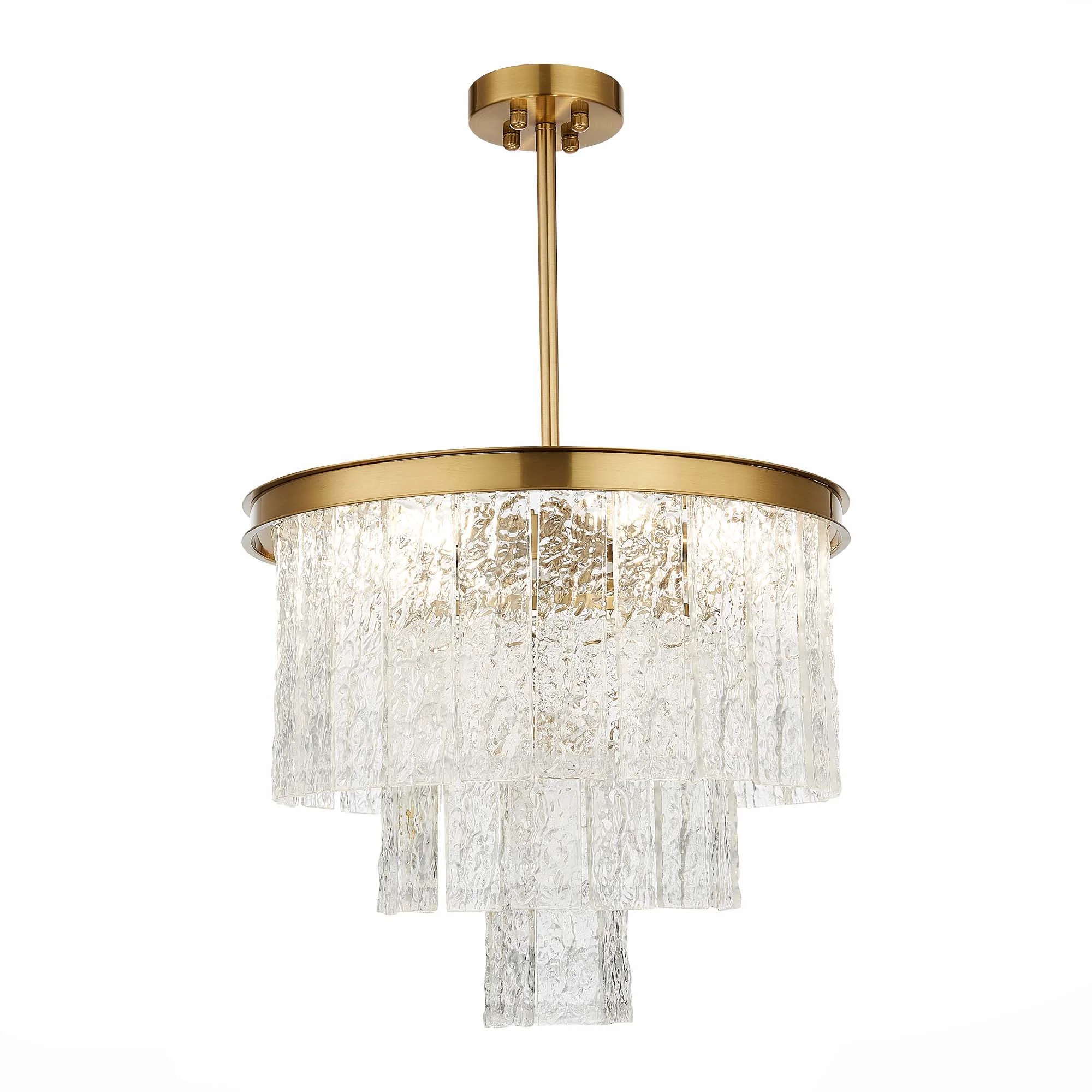 Цилиндрические плафоны из прозрачного стекла с легким рельефом и вытянутые вниз декоративные элементы рожков напоминают по форме факел и придают дизайну коллекции Acazio строгость и благородство классики. Отсутствие лишних деталей и прямые линии делают образ современным и подходящим для различных интерьеров. Высота люстр регулируется длиной цепи