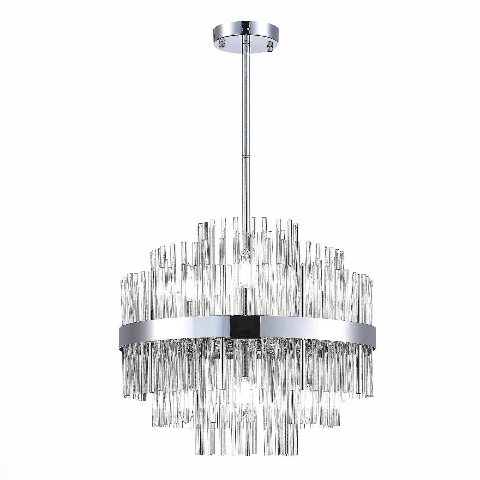 Металл и стекло полноправно взаимодействуют в дизайне коллекции OLVERA. Трубочки из хрустального стекла и металла опоясаны лентой, состоящей из нескольких элементов. Крепление на тросы делает конструкцию визуально более легкой, а дополнительное кольцо помогает сбалансировать конструкцию при подвешивании. Широкий размерный ряд позволяет использовать светильники в разных помещениях и для разных целей.