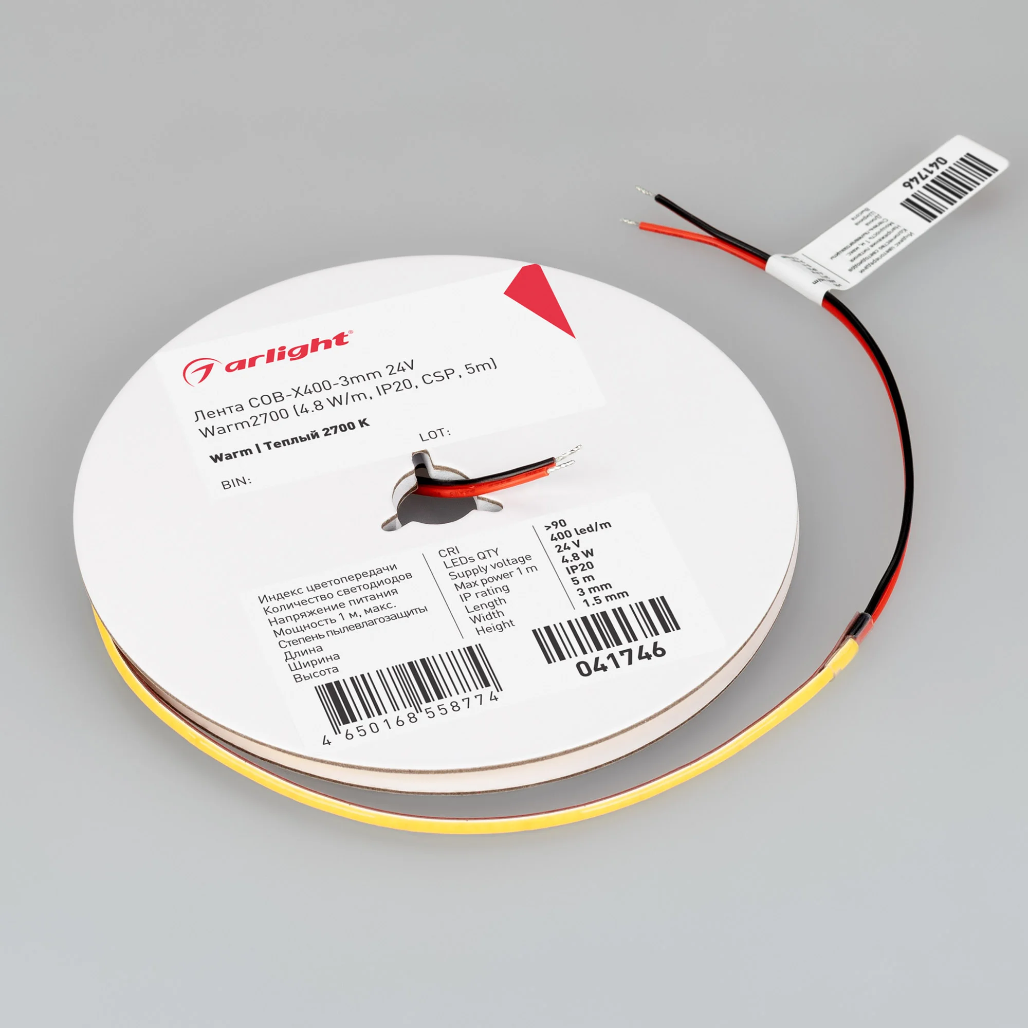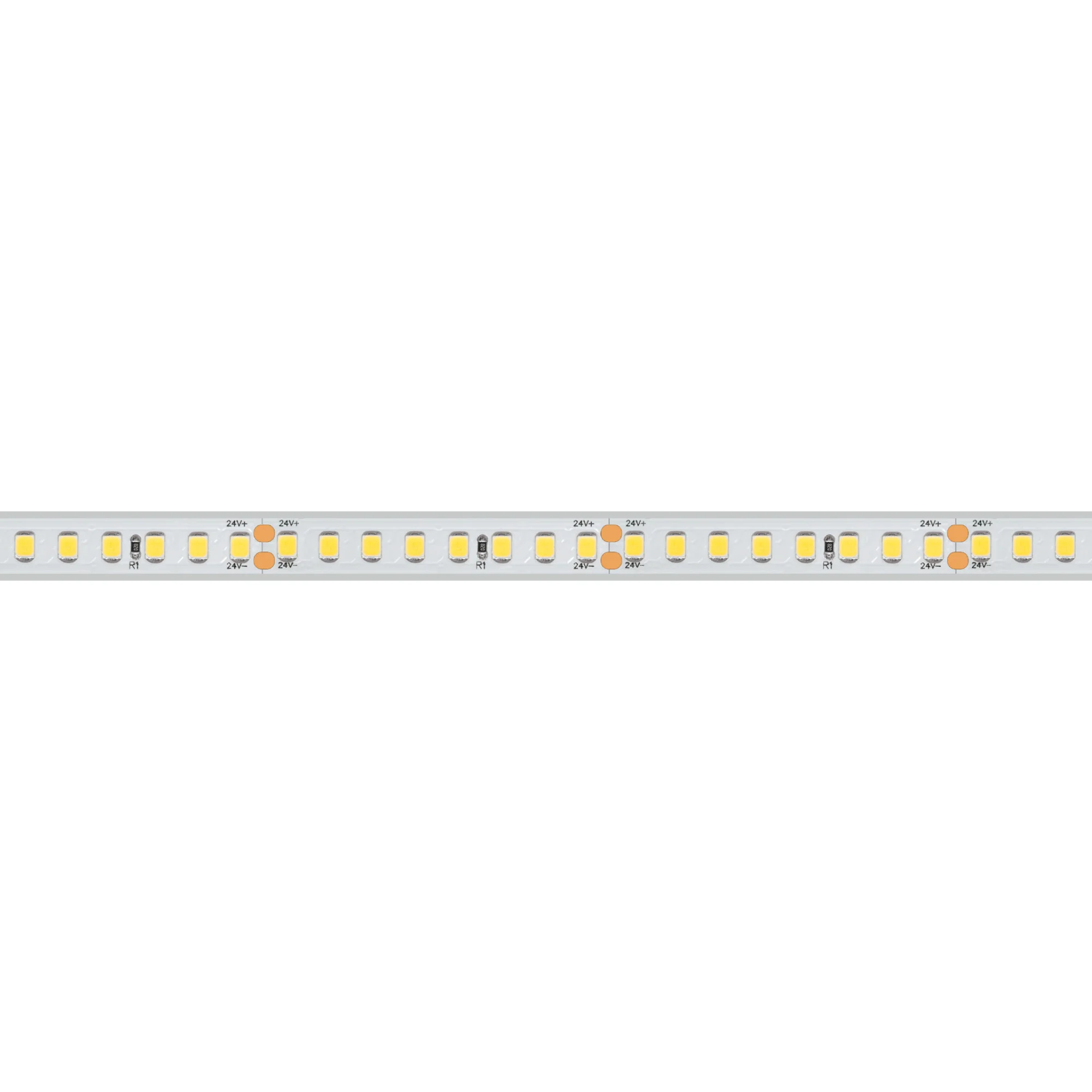 Светодиодная лента сплошного свечения COB серии X480. Светодиоды CSP, 480 шт/м, белая плата шириной 6 мм, скотч 3M. Цвет ТЕПЛЫЙ 2700K, индекс цветопередачи CRI>90, угол 180°. Питание 24 В, мощность 6 Вт/м (30 Вт на 5 м). Размеры 5000х6х1.8 мм. Мин. отрезок 50 мм. Цена за 1 м. Кратность заказа поставщику: 5 м.