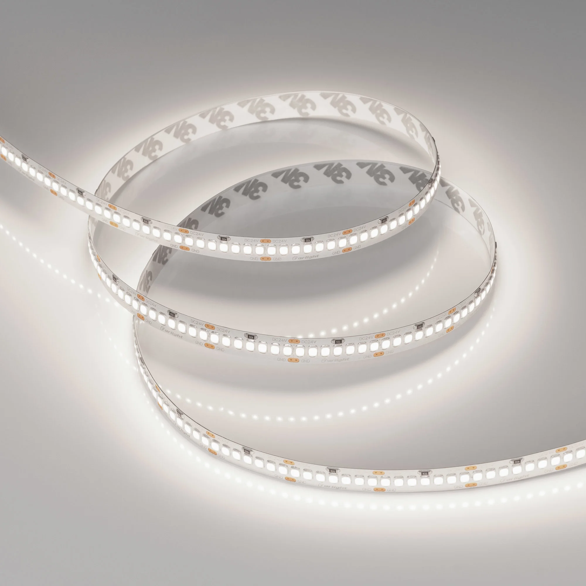 Светодиодная лента RT серии A120. Светодиоды SMD 2835, 120 шт/м, белая плата шириной 8 мм, скотч 3M. Цвет ДНЕВНОЙ 5000K, индекс цветопередачи CRI>85, угол 120°. Питание 12 В, мощность 9.6 Вт/м (48 Вт на 5 м). Размеры 5000x8x1.5 мм. Мин. отрезок 25 мм, 3 светодиода. Цена за 1 м. Кратность заказа поставщику: 5 м.