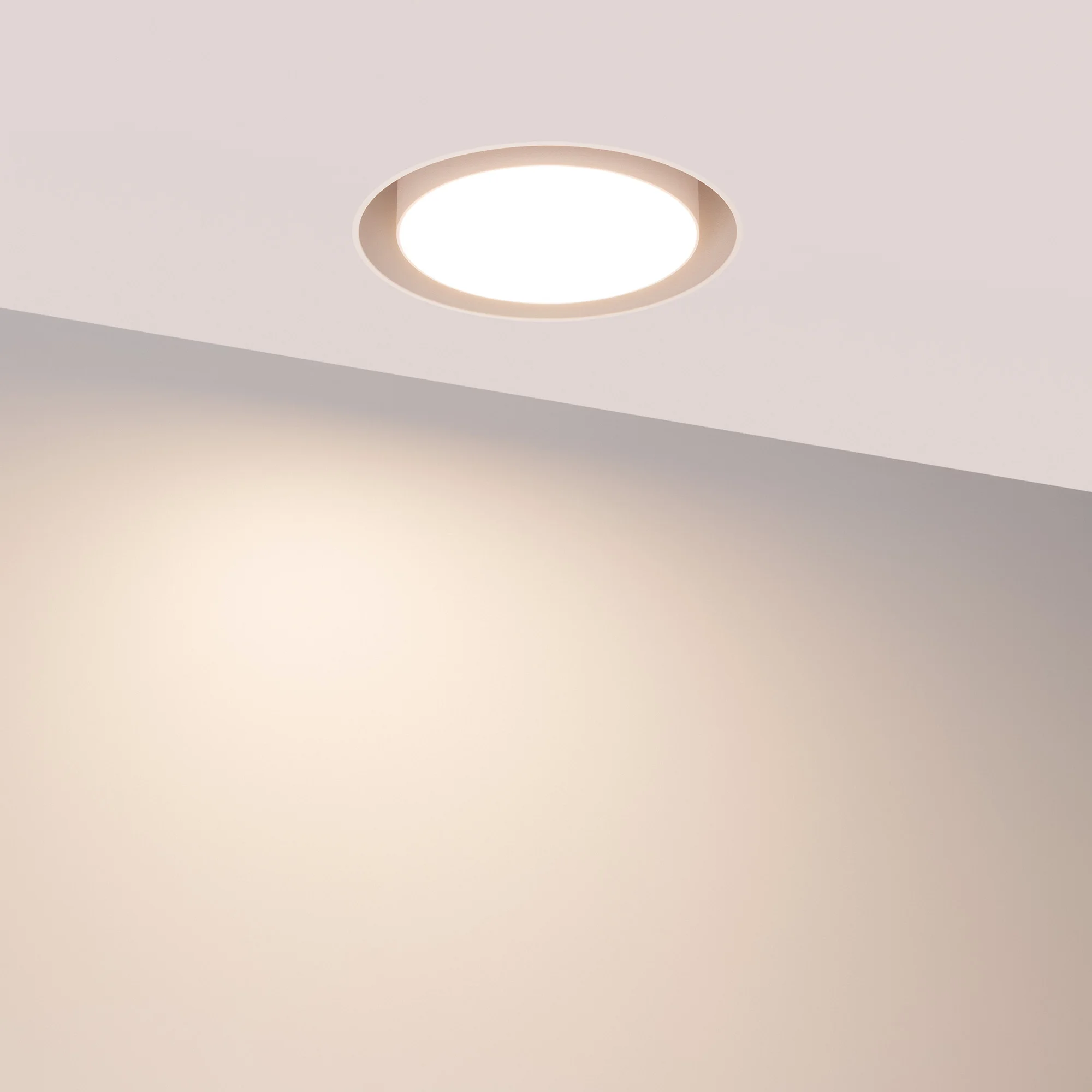 Встраиваемый светильник даунлайт с изменяемой мощностью и цветовой температурой. Мощность 9-12 Вт, св. поток 950-1310лм, 100 лм/Вт, цветовая температура 3000-4000-5700 K, CRI>90, угол 60°, напряжение питания 230 В. Белый круглый корпус, степень защиты IP54. Размер: диаметр 140 мм, высота 80 мм. Монтаж встраиваемый, установочное отверстие: диаметр 122-127 мм. TRIAC-драйвер, пульсация <1%.