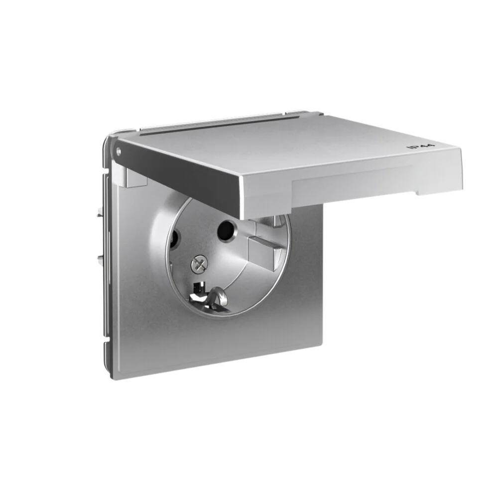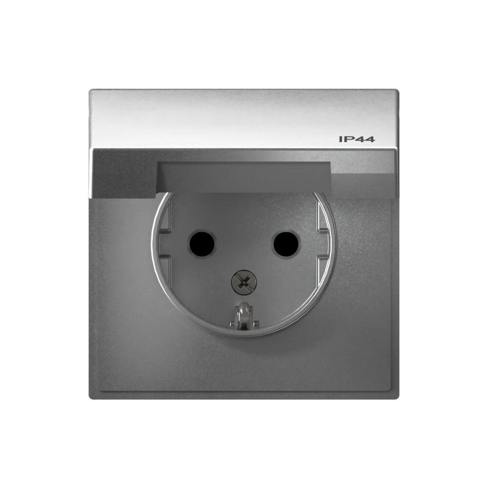 Systeme Electric Glossa Алюминий Розетка с/з со шторками с крышкой, IP20 (в сборе с рамкой)