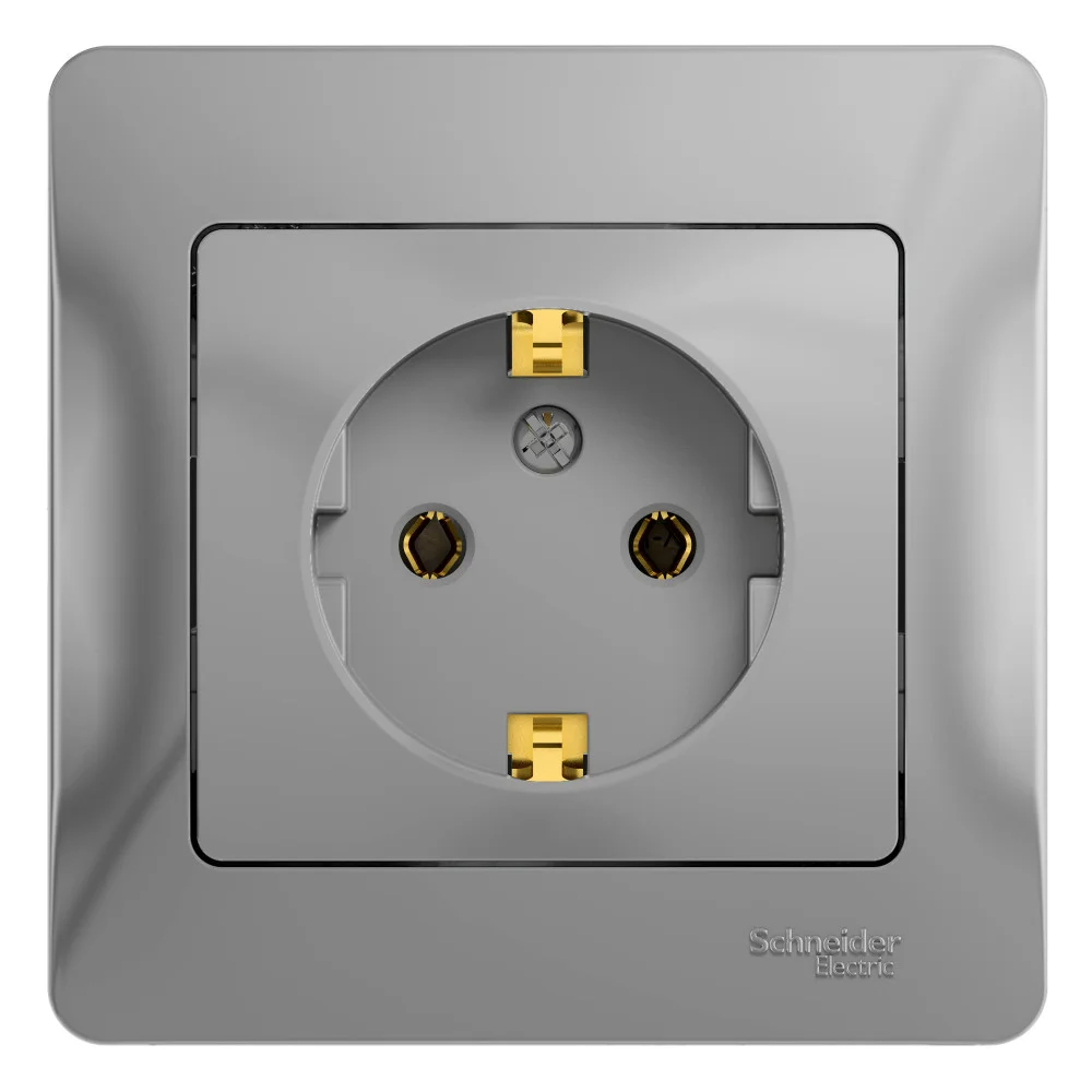 Розетка Systeme Electric (ранее Schneider Electric) серии Glossa (в сборе, цвет алюминий) одинарная без заземления и без шторок подходит для сетей 250 В, на ток 16 А. — Выполнен из материала PС+ASA, стойкого к УФ-излучению и появлению царапин. — Эргономичные клеммы розеток расположены в один ряд.