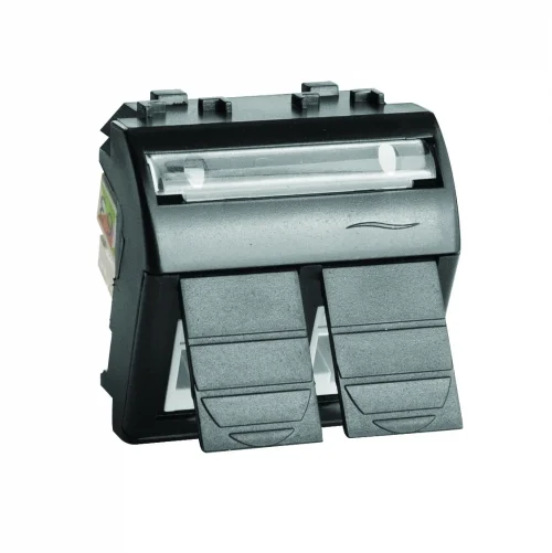 Розетка компьютерная RJ-45 с 2 разъемами. Назначение: подсоединение кабеля к компьютеру, принтеру и прочей оргтехнике. Характеристики: 8P8C; комплектуются 2-модульными гнездами; для заделки контактов в розетки использовать инструмент типа 110; с пылезащитными шторками (крышками); с окном (полем) для маркировки «рабочего места», размер окна − 6х37 мм. Категория: 6, экранированная. Кол-во модулей: 2. Цвет: черный