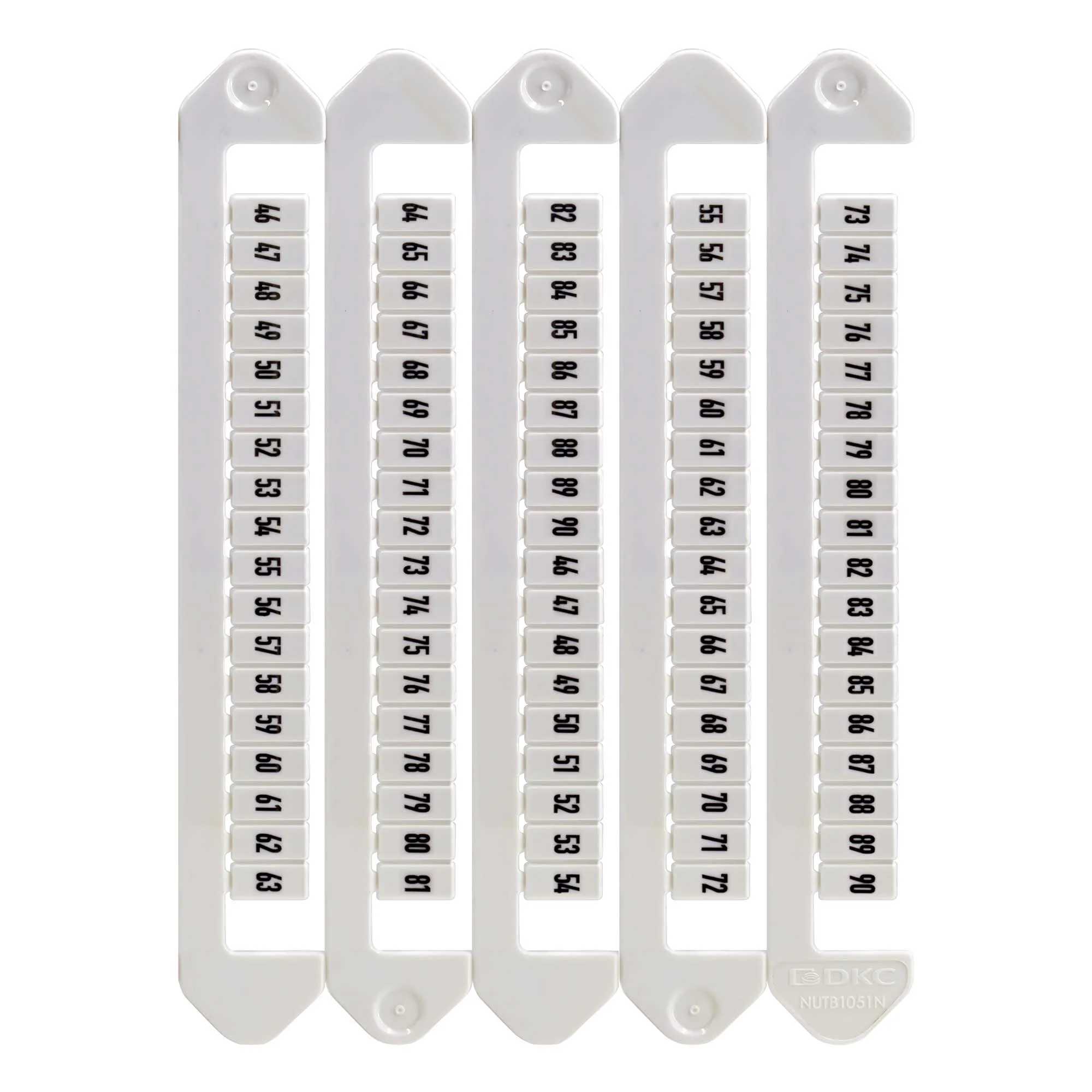 Маркировка кле мм «Nuputuk» изготавливается из композиционного материала АБС-ПК. Класс горючести по UL94 – V0. Температура эксплуатации: от −40 до +80 °С. Цвет – белый. Фиксируется на клеммах защелкиванием. Символы от 61 до 70, горизонтальная ориентация. Тег размером 5х10 мм. На пластине 90 тегов. В упаковке 5 пластин – 450 тегов.