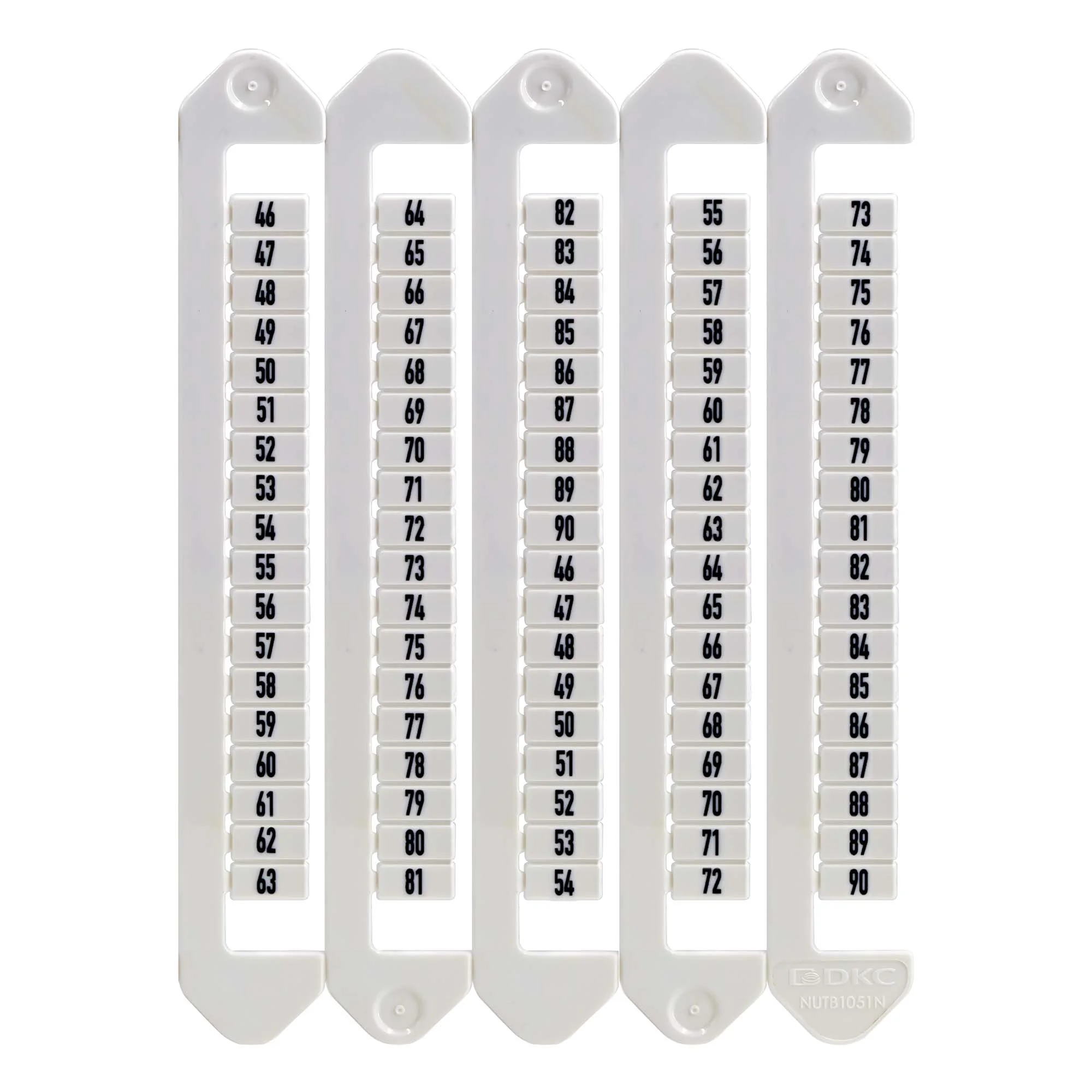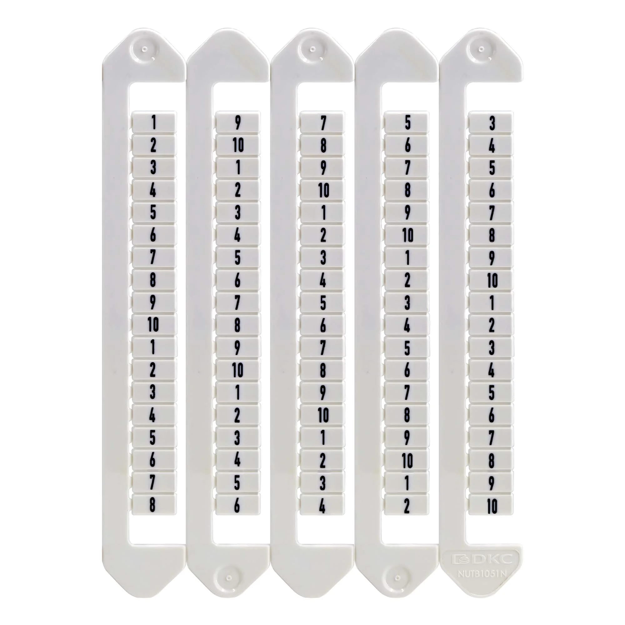 Маркировка кле мм «Nuputuk» изготавливается из композиционного материала АБС-ПК. Класс горючести по UL94 – V0. Температура эксплуатации: от −40 до +80 °С. Цвет – белый. Фиксируется на клеммах защелкиванием. Символы от 51 до 60, вертикальная ориентация. Тег размером 5х10 мм. На пластине 90 тегов. В упаковке 5 пластин – 450 тегов.