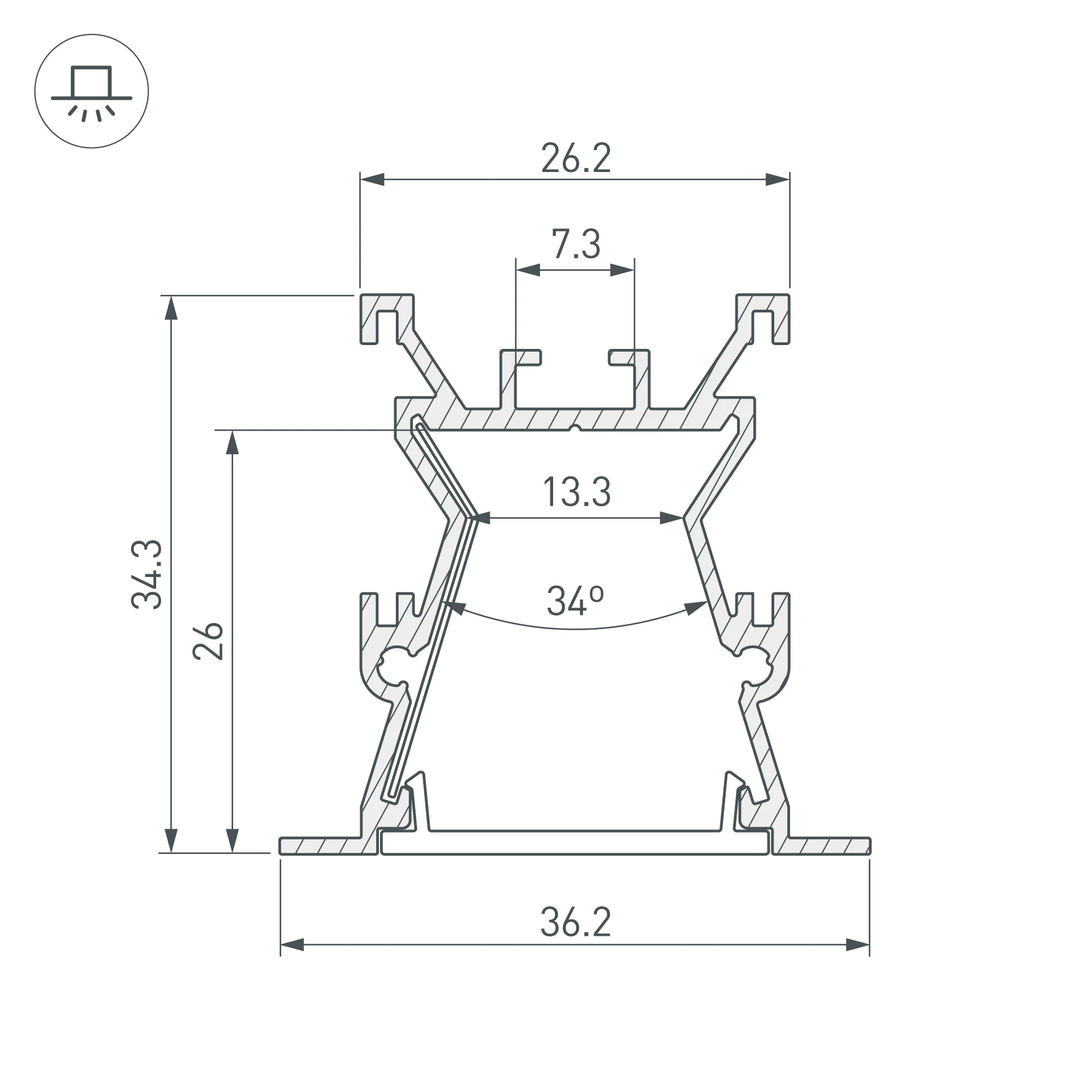 Алюминиевый профиль для составления круга диаметром 1500мм, для радиусной светодиодной линейки, с выводом свечения вниз, длина 1/8 от круга 1500мм. Внутренний диаметр круга 1465мм, внешний диаметр круга 1535мм. Цвет — серый RAL9006 (порошковая окраска). Габаритные размеры (L×W×H): 589,05x35x35 мм. Ширина площадки для ленты — 24 мм. Профиль укомплектован рефлектором. Экраны, заглушки и другие аксессуары приобретаются […]